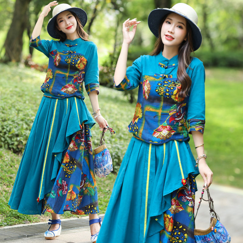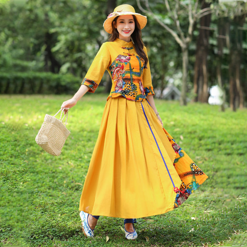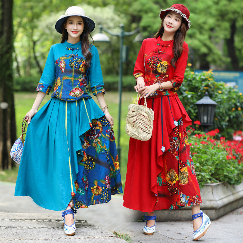 唐装女装中国风复古中式盘扣改良旗袍式上衣民族风棉麻套装两件套