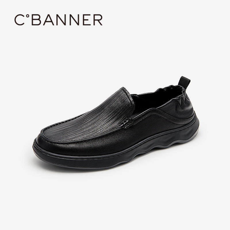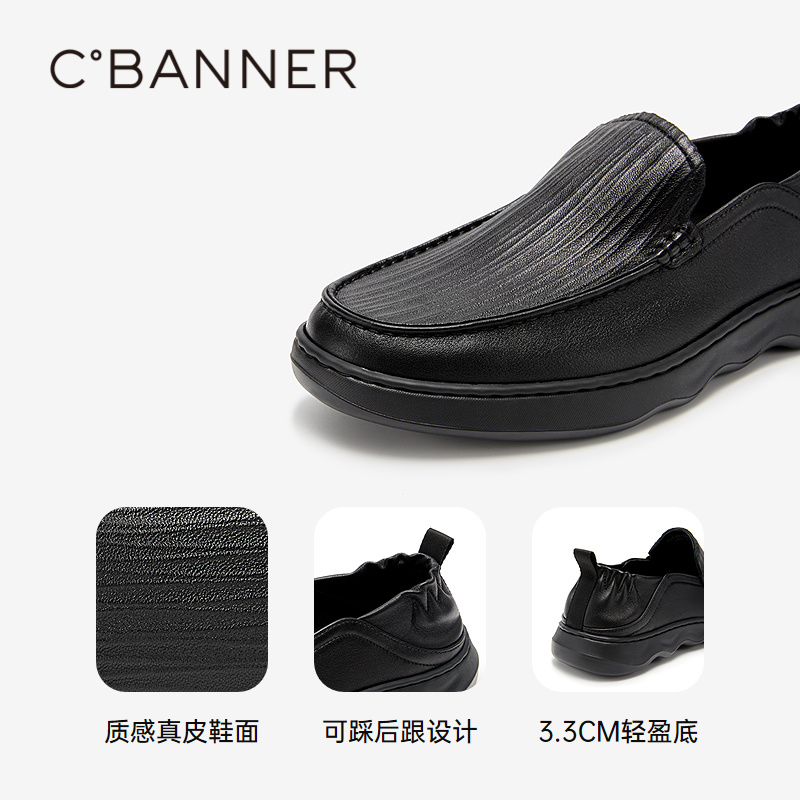 千百度男鞋黑色休闲皮鞋2025夏季新款厚底轻便男士一脚蹬两穿皮鞋