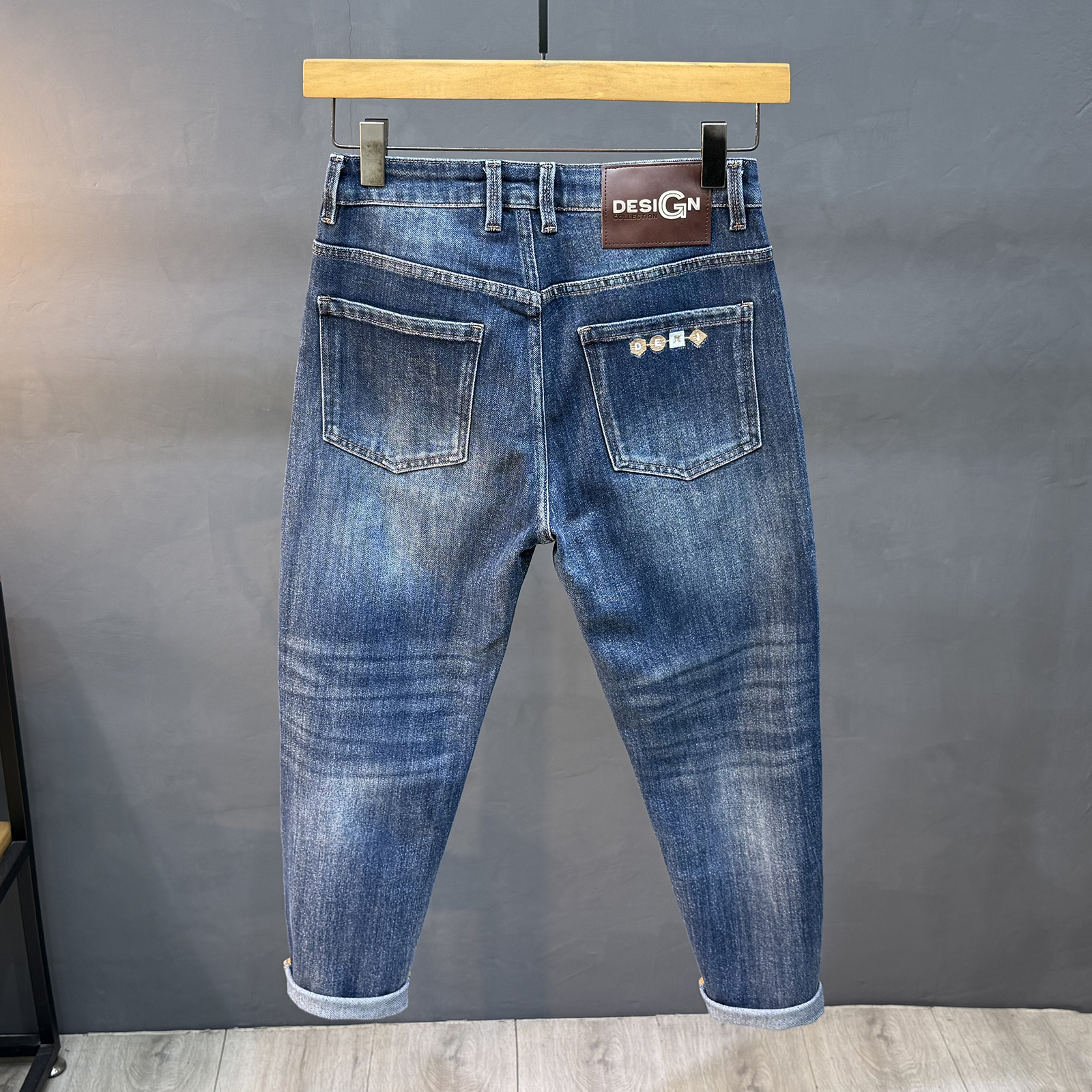 轻奢柔软九分刺绣牛仔裤男士莱赛尔四面弹力锥形宽松小脚百搭长裤