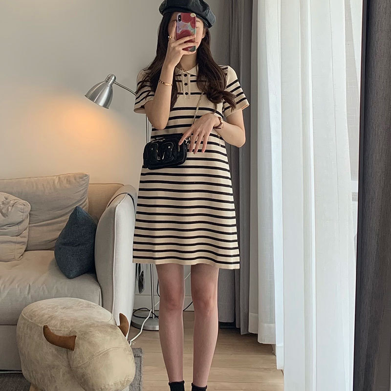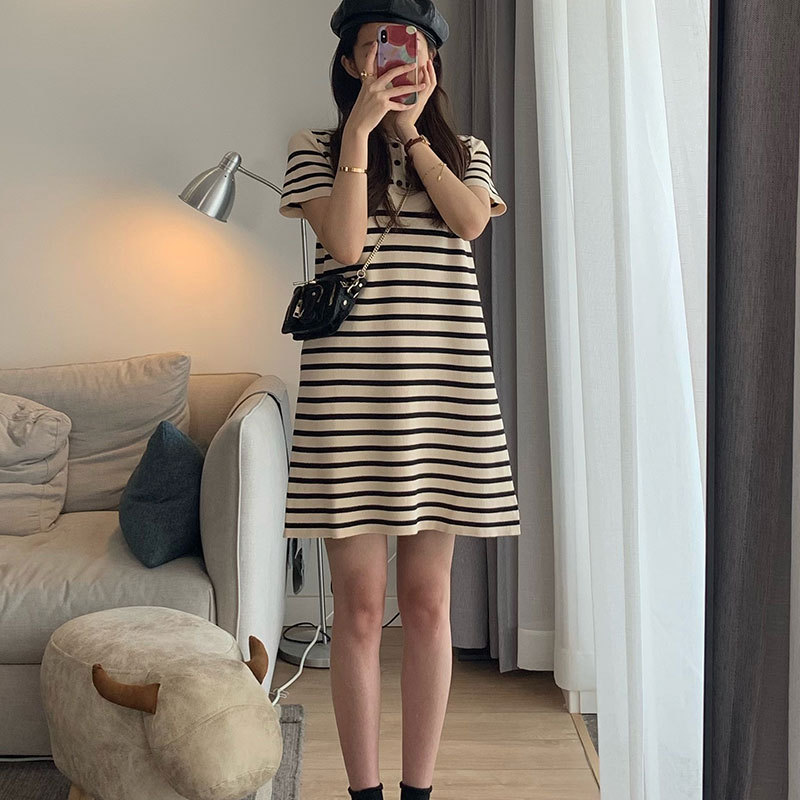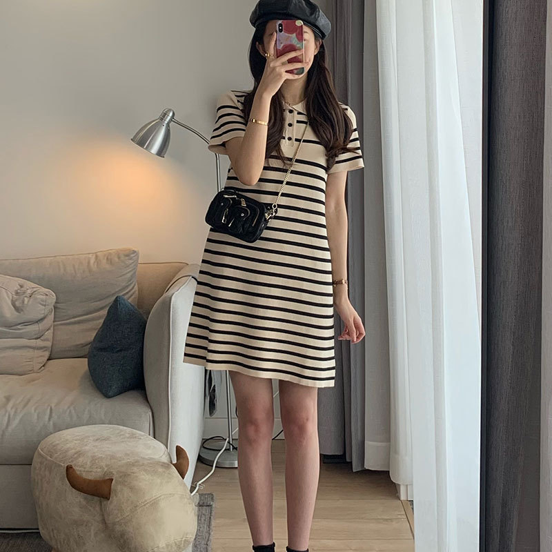 连衣裙女2025新款夏季薄款宽松中长款polo领条纹洋气短袖t恤裙子