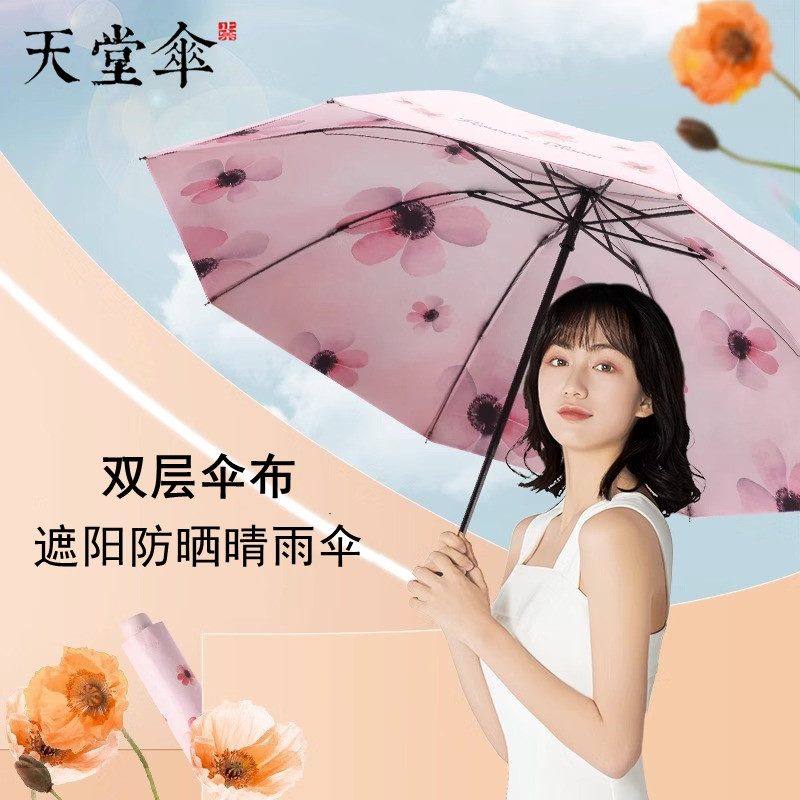 天堂伞正品高颜值加厚黑胶晴雨两用抗风三折双层便携折叠女士雨伞