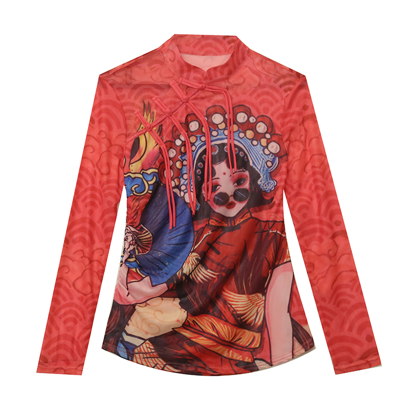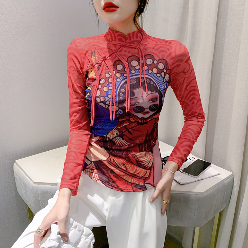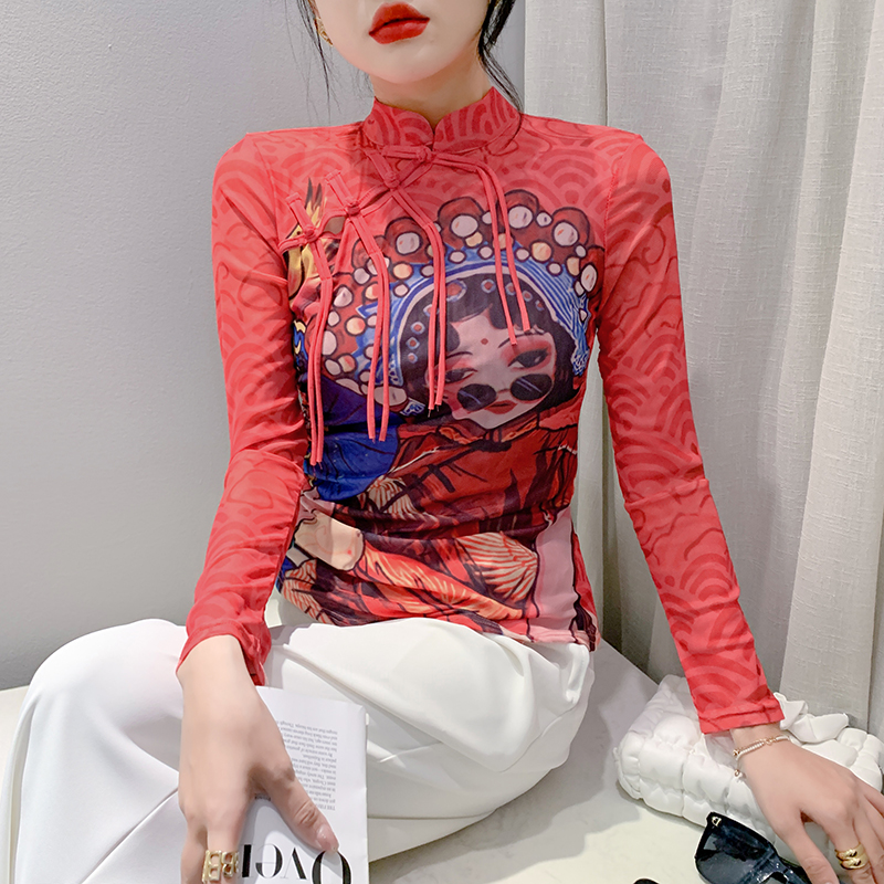设计感盘扣立领印花长袖T恤女2023秋冬网纱打底衫减龄百搭上衣潮