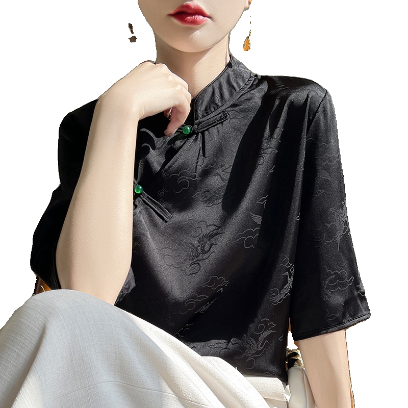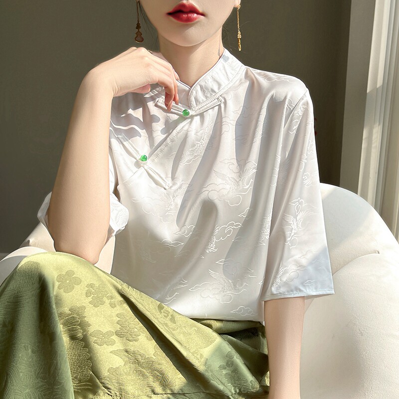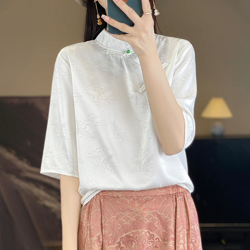 新款立领提花短袖上衣女夏季新款复古气质真丝桑蚕丝白色衬衫