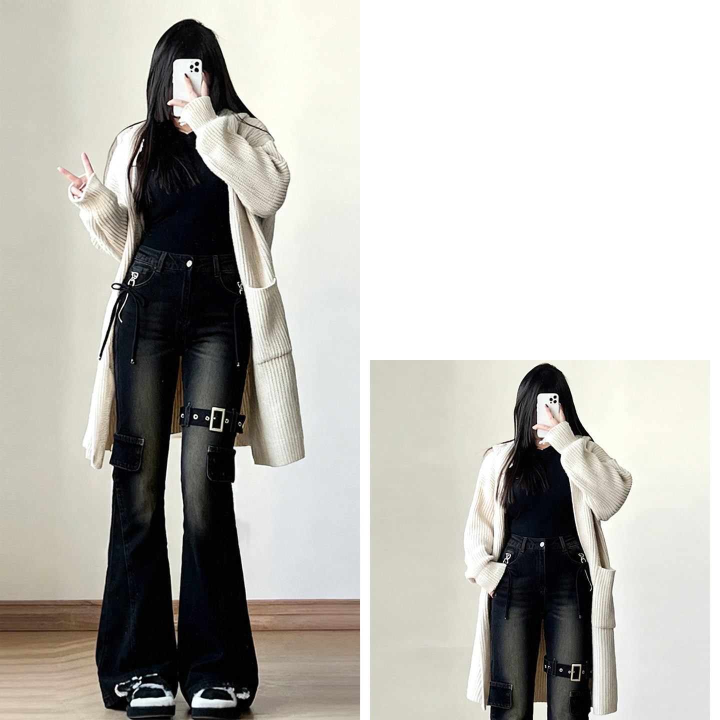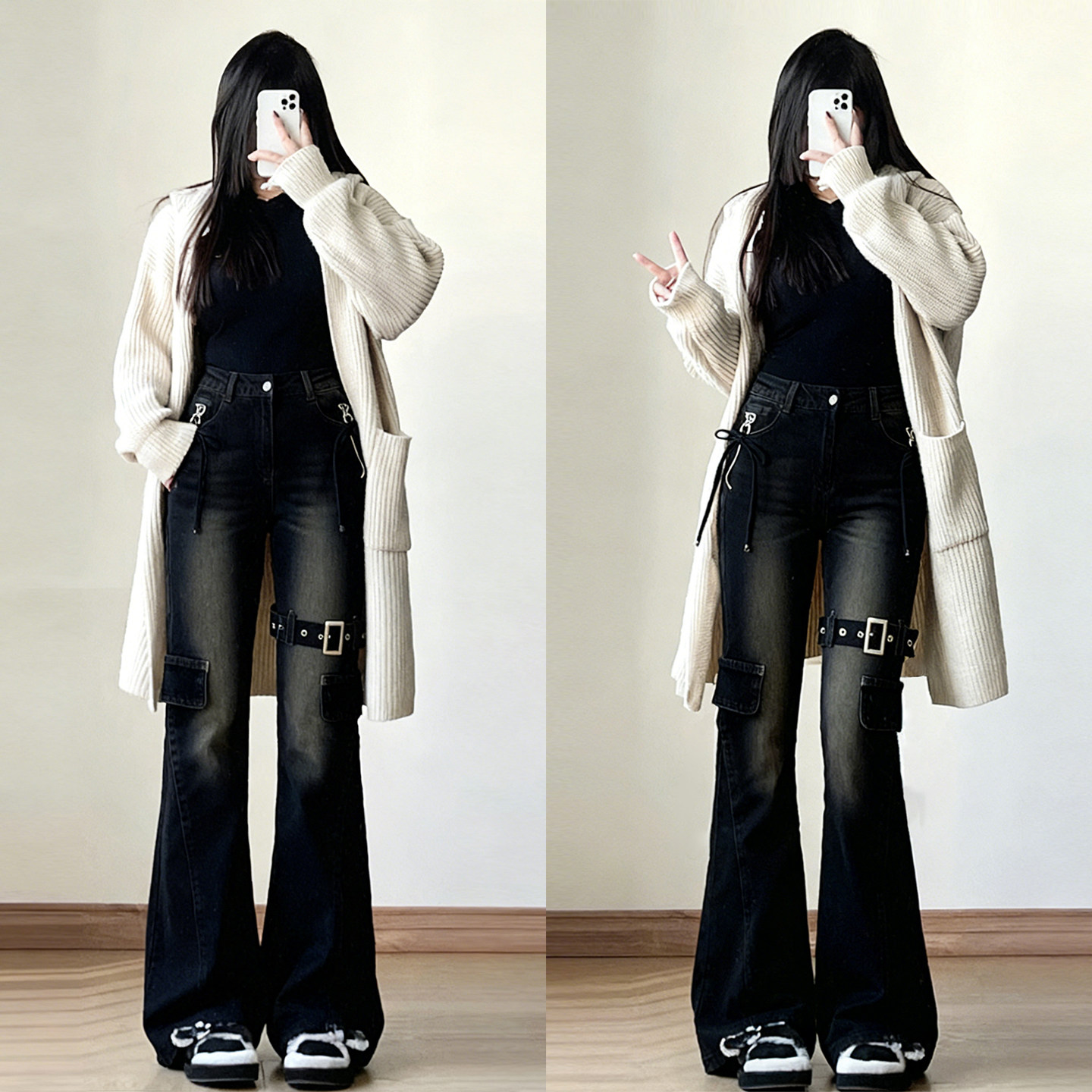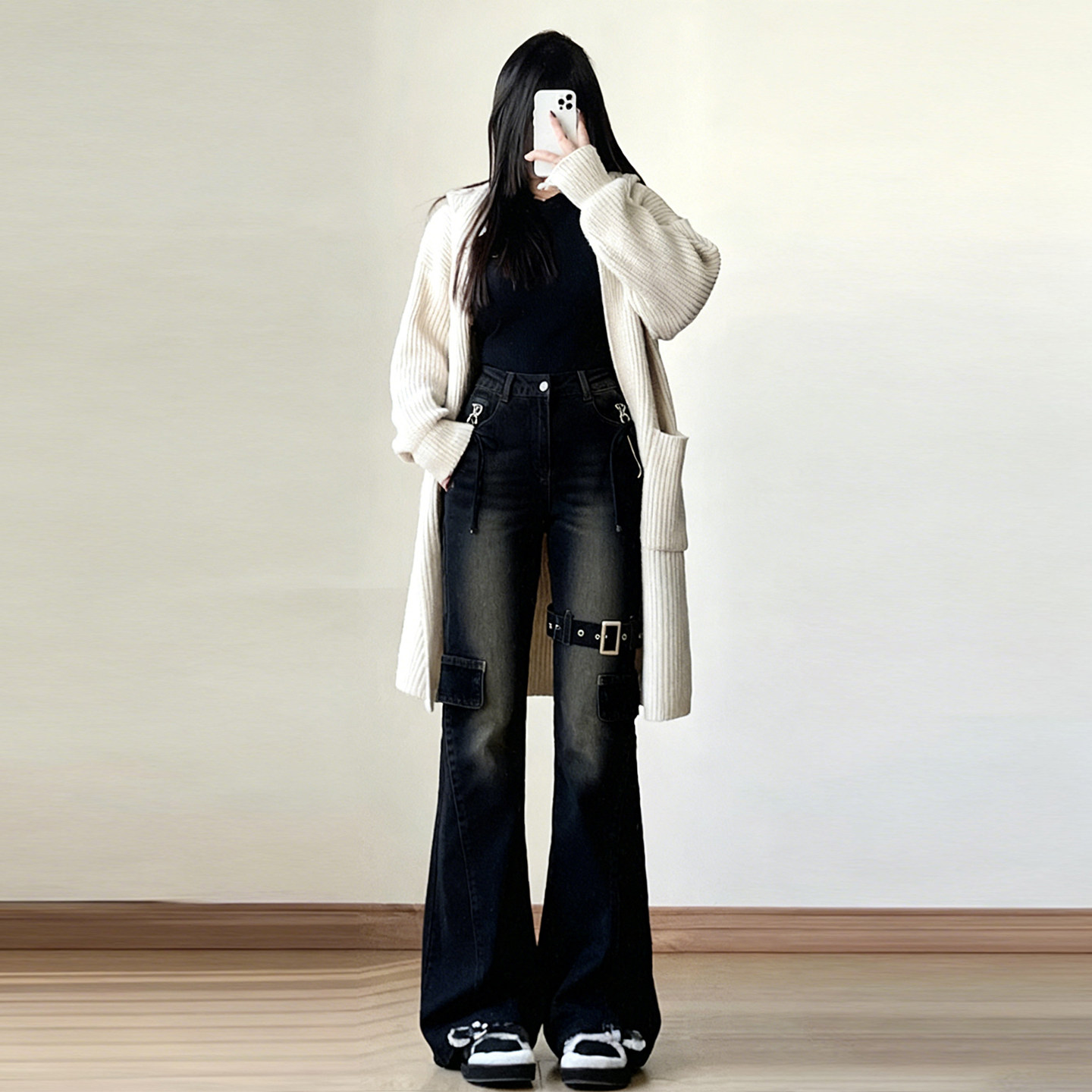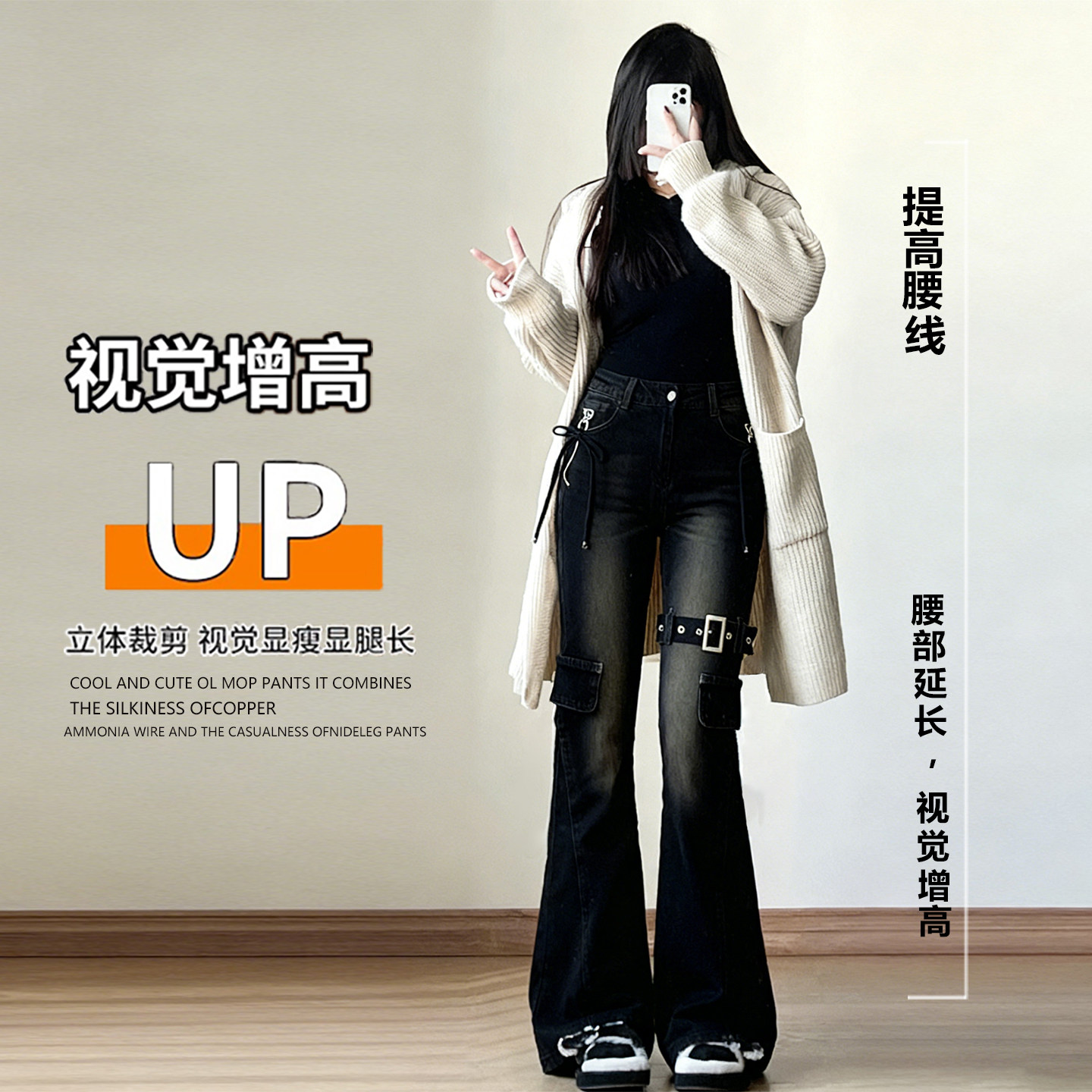 胖mm大码女装美式穿搭弹力牛仔裤女高街辣妹风多口袋工装微喇裤子