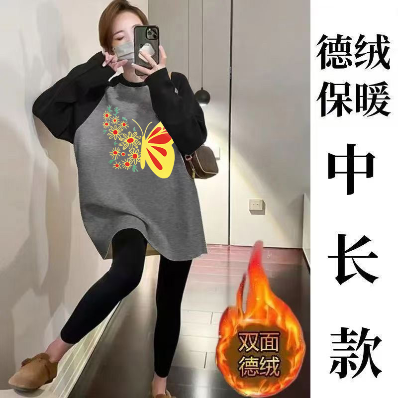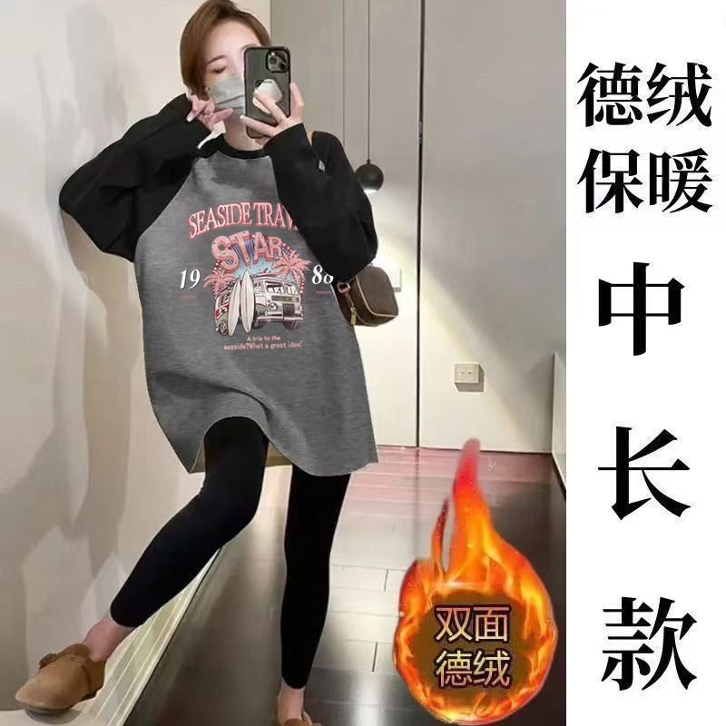 秋冬德绒保暖上衣T恤女长袖中长款打底衫插肩袖印花休闲显瘦上衣