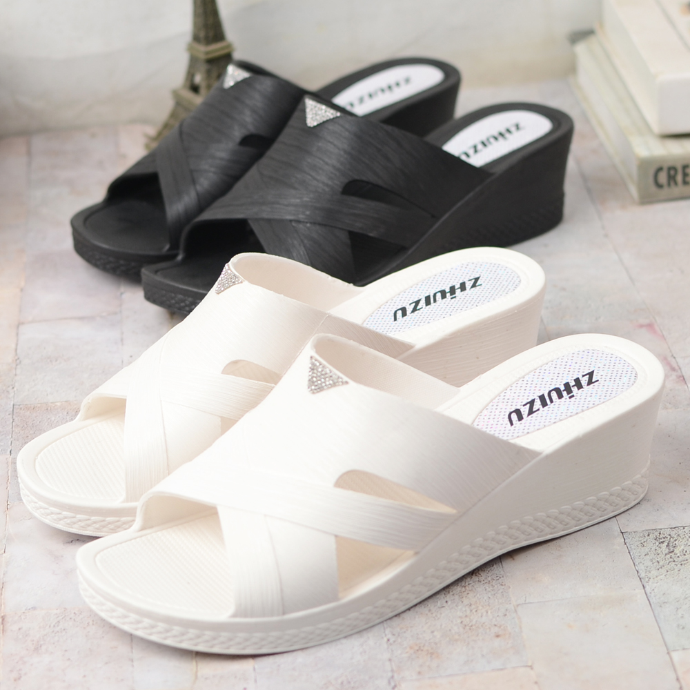 2023夏厚底坡跟凉拖鞋女纯色中老年妈妈高跟室内外穿一字沙滩拖鞋