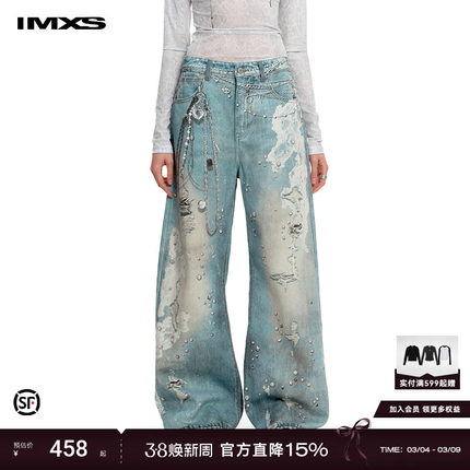 IMXS【明星同款】蕾丝印花牛仔裤脏脏复古微喇阔腿休闲长裤2025年