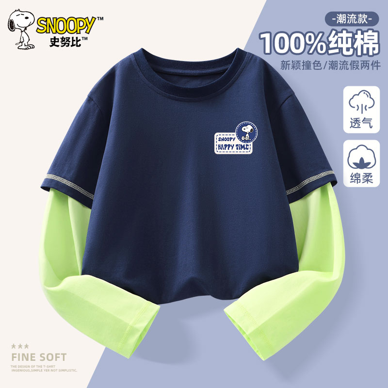 史努比男童长袖t恤春秋款2025新款男孩假两件打底衫儿童纯棉上衣