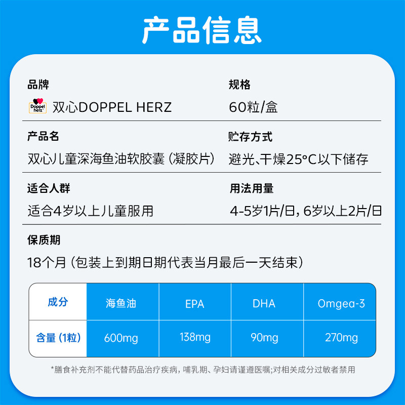 两盒欧洲直邮德国双心儿童青少年omega3深海鱼油DHA/epa护眼益脑