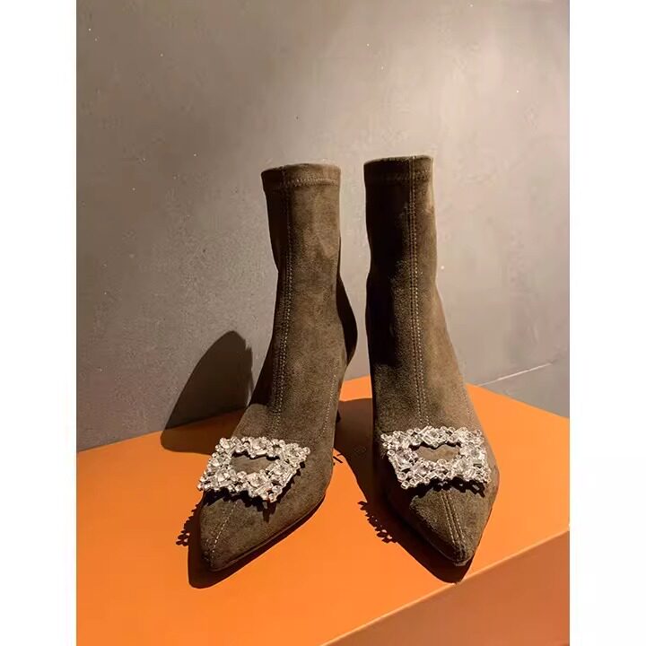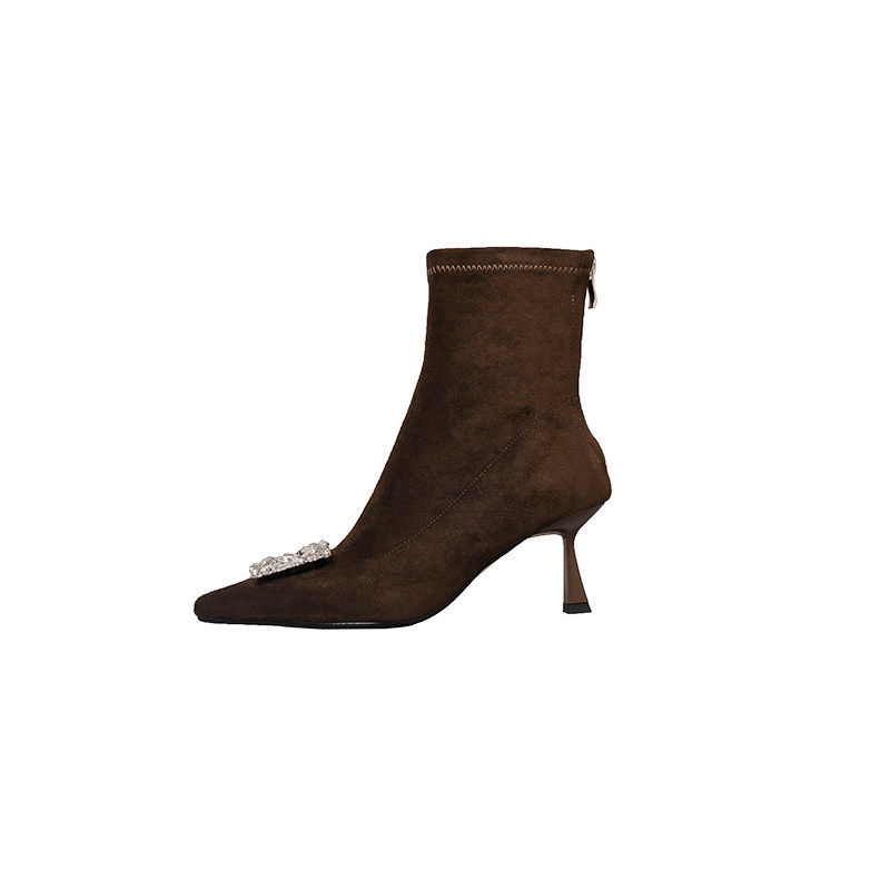 法式气质名媛小踝靴弹力瘦瘦方扣袜靴尖头细跟高跟磨砂单跟短靴女