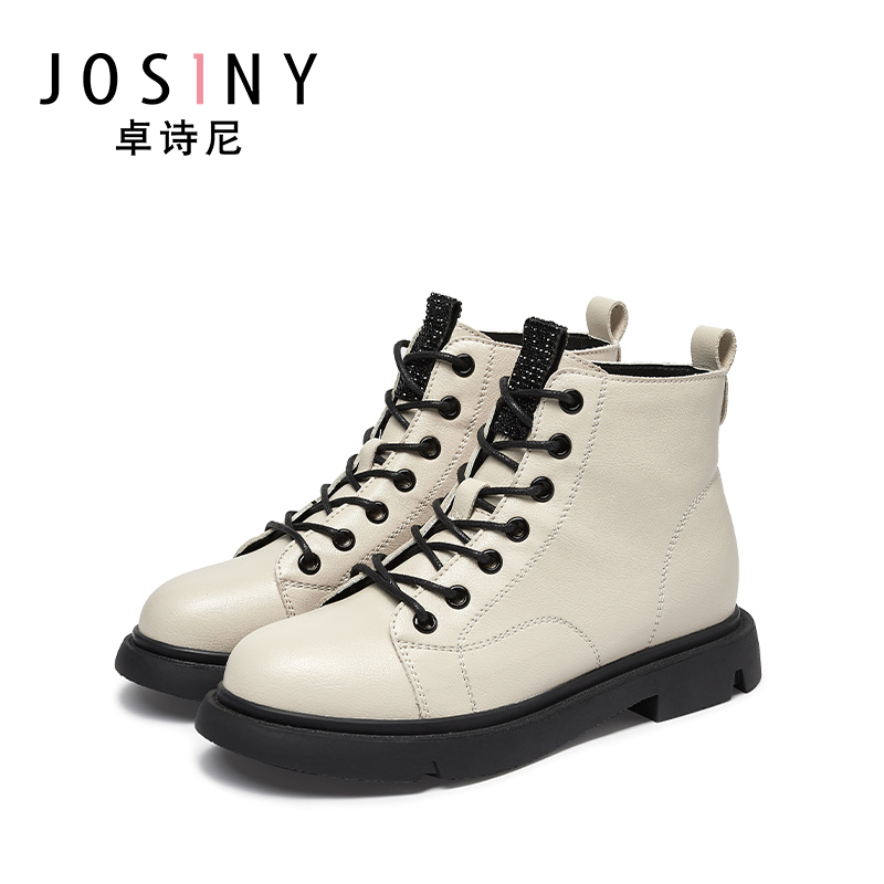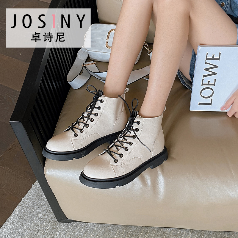 卓诗尼秋冬季加绒加厚女士短筒靴子圆头平底系带韩版日常马丁靴子