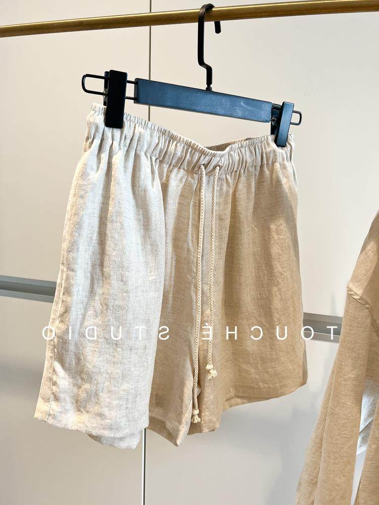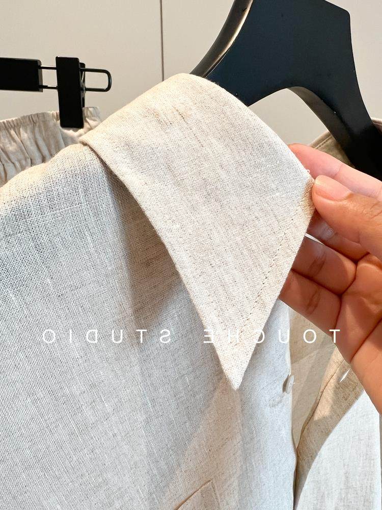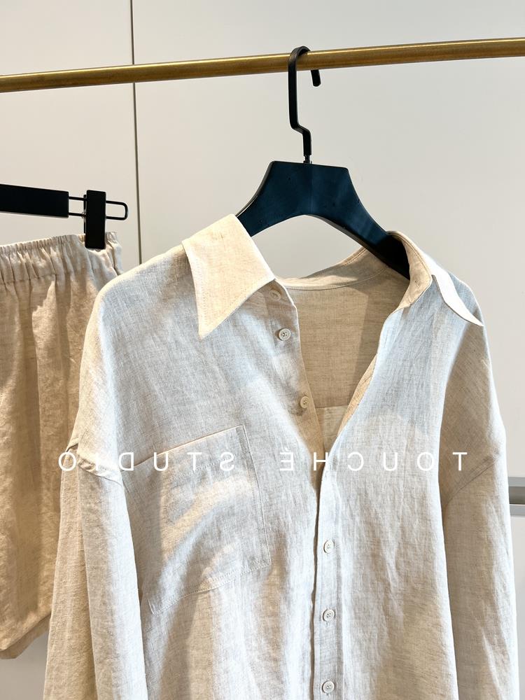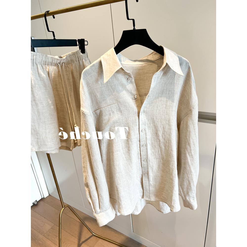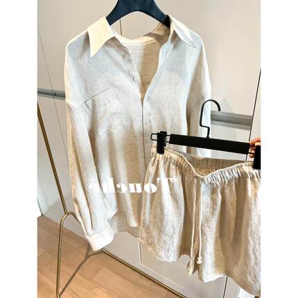 清仓捡漏~专柜撤回外贸女装百搭洋气亚麻套装宽松长袖衬衫+短裤女