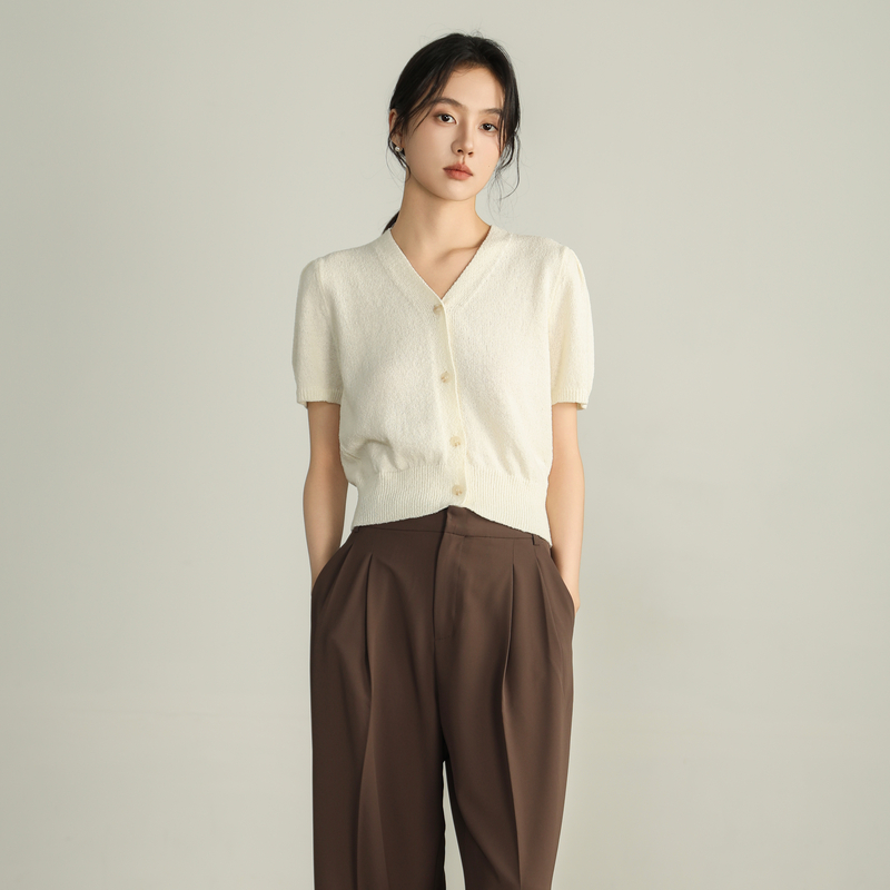 AIRIQI夏季新款法式V领修身收腰显瘦短款针织开衫女AH42KS107