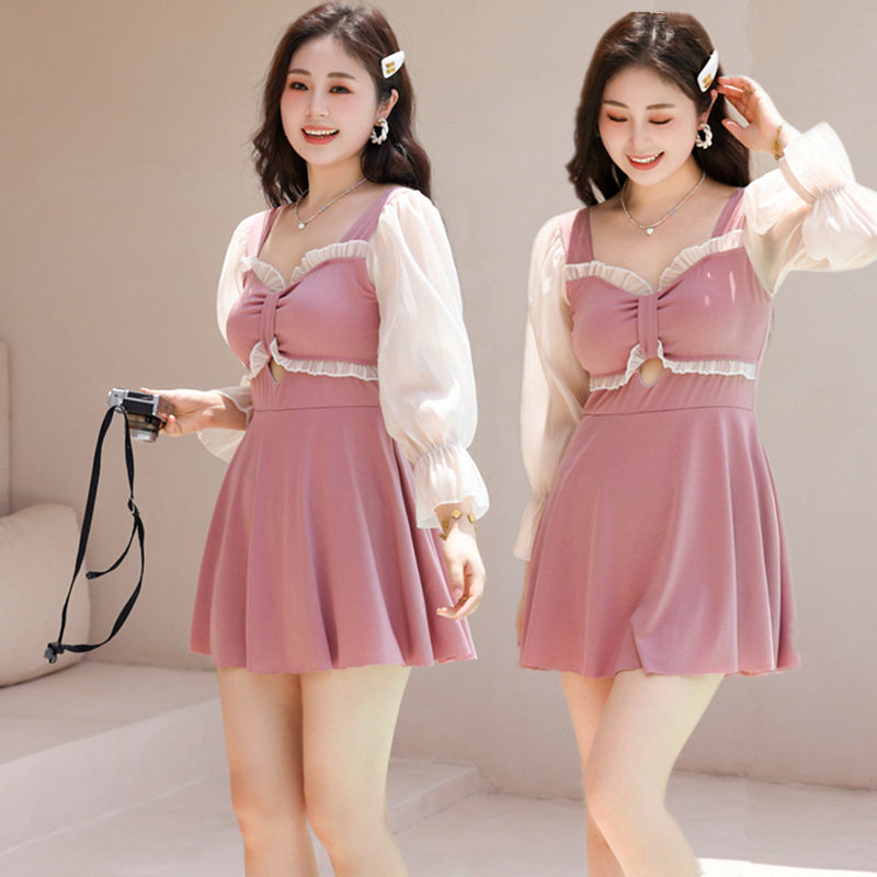微胖女孩游泳衣女连体平角加大码长袖保守遮肚显瘦温泉胖妹游泳装