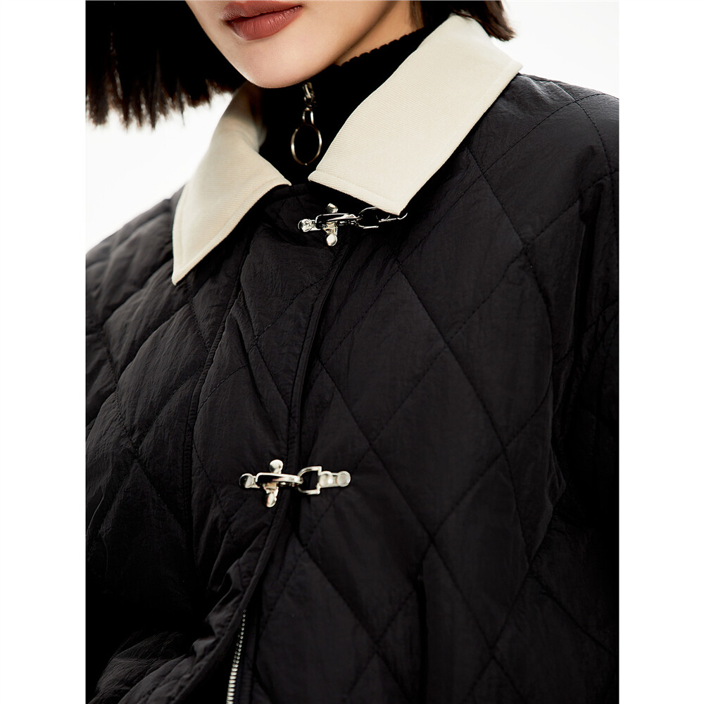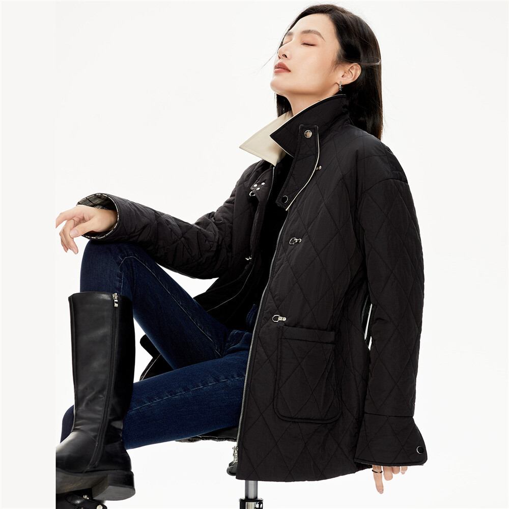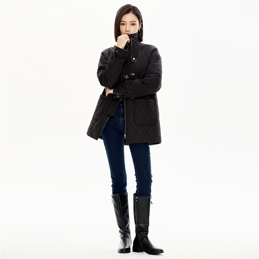 佐丹奴外套女装格纹梭织可立领宽松中长款棉衣外套 18373915