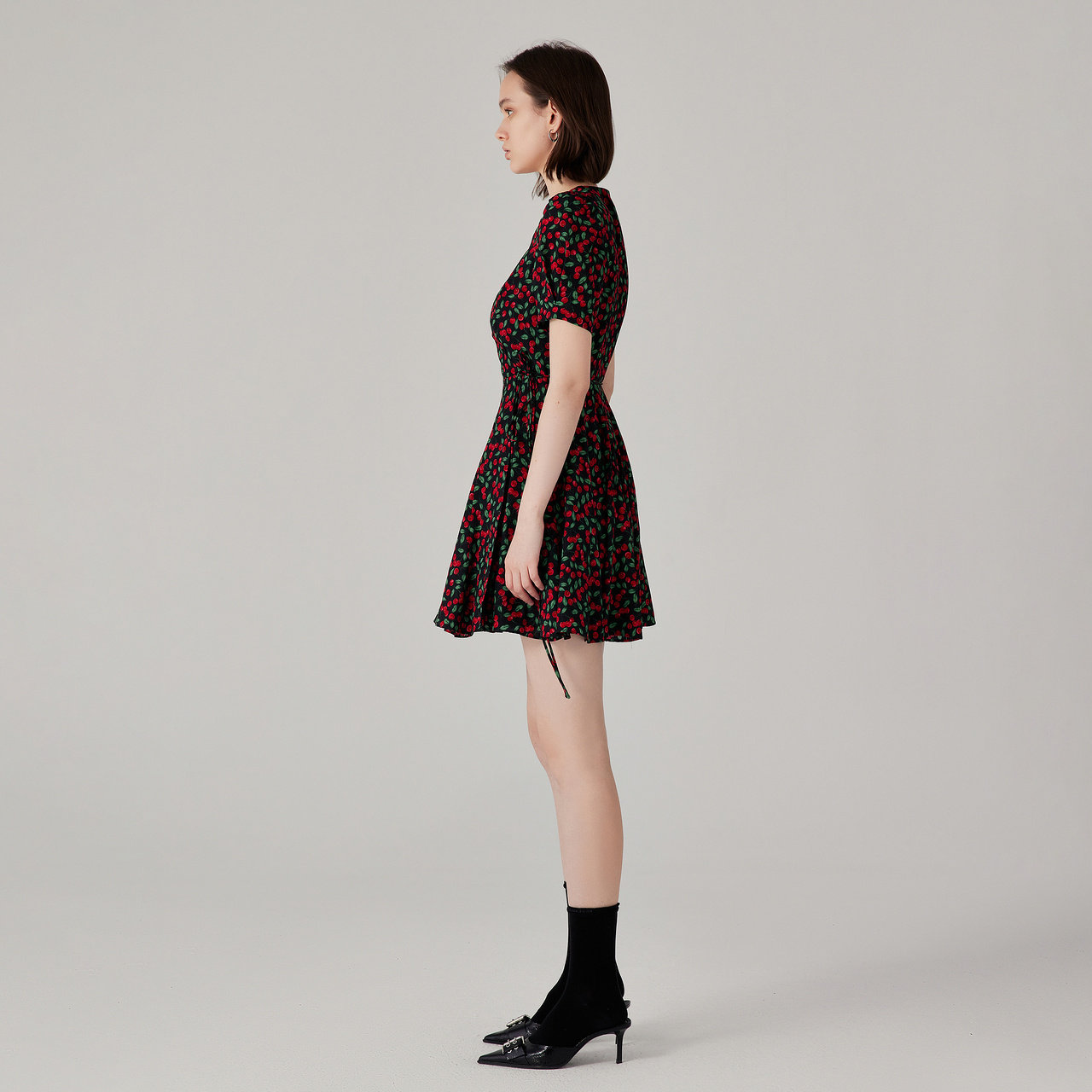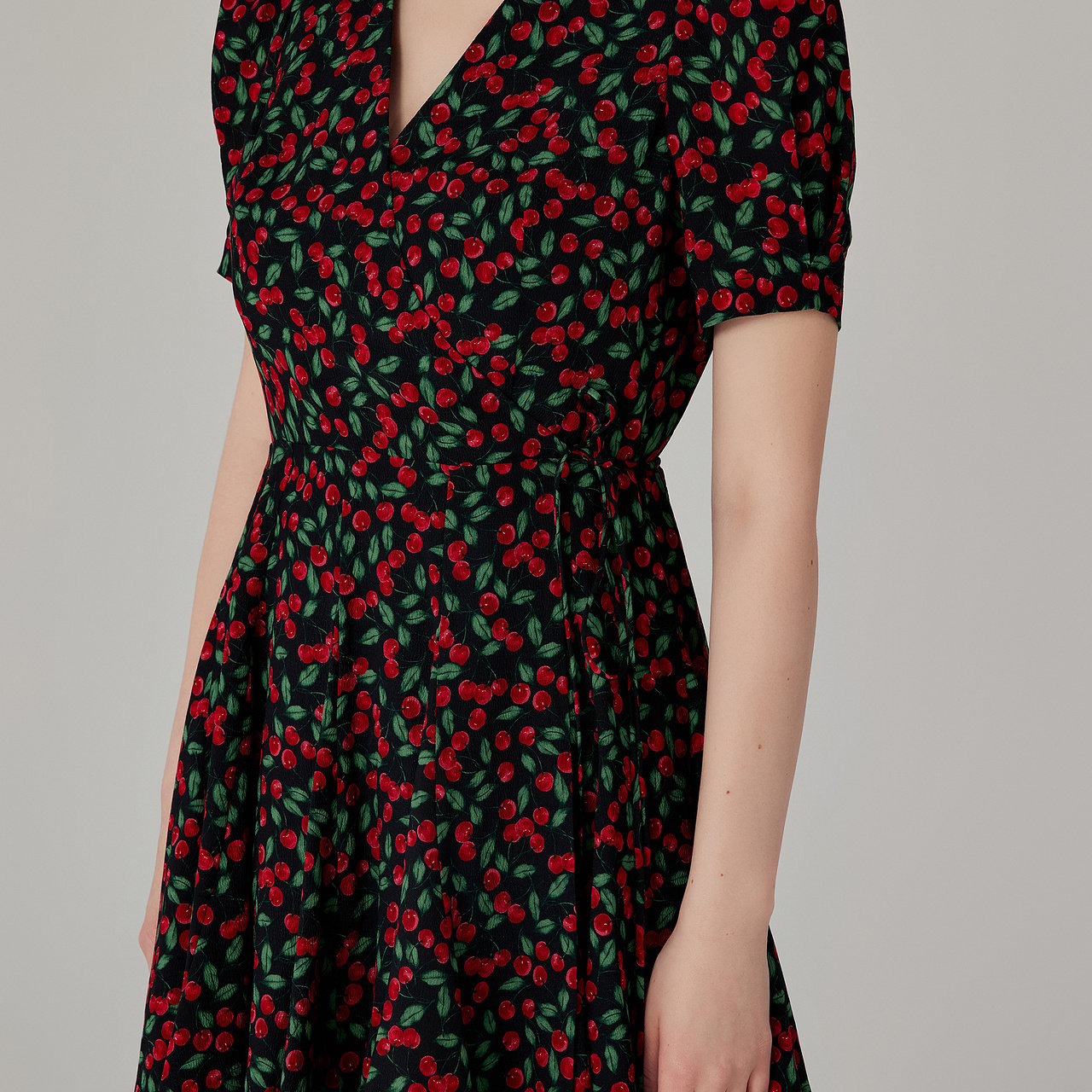 【七七酱直播间】商场同款 摩萨克秋装V领短袖高腰樱桃印花连衣裙
