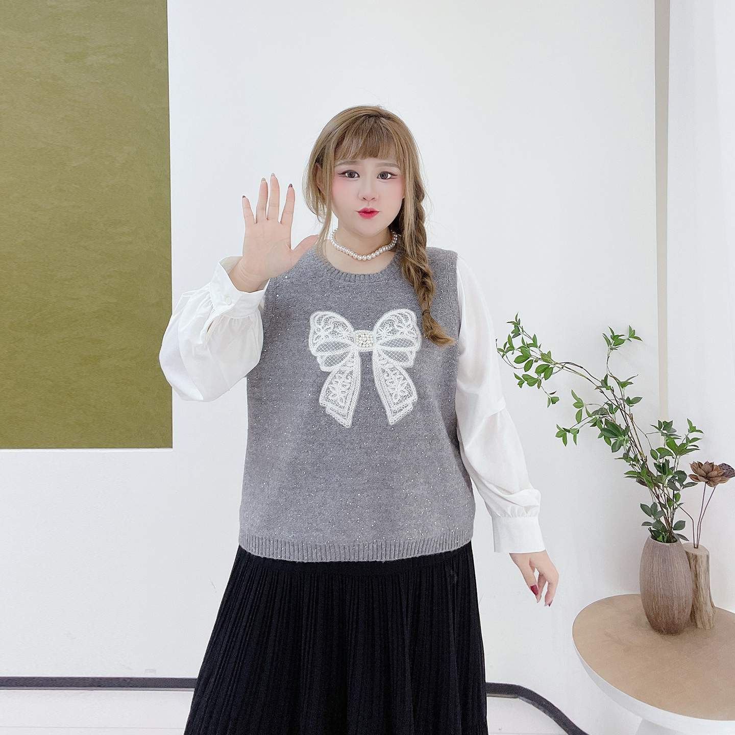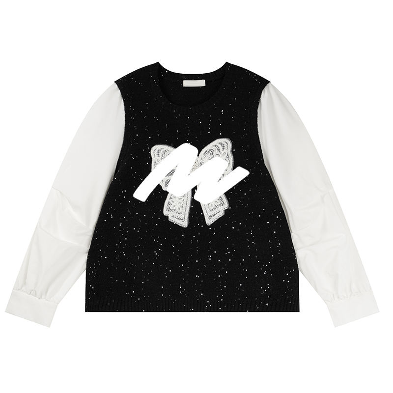 甜美蝴蝶结亮片内搭上衣胖莹莹大码秋冬撞色减龄钉珠假两件针织衫