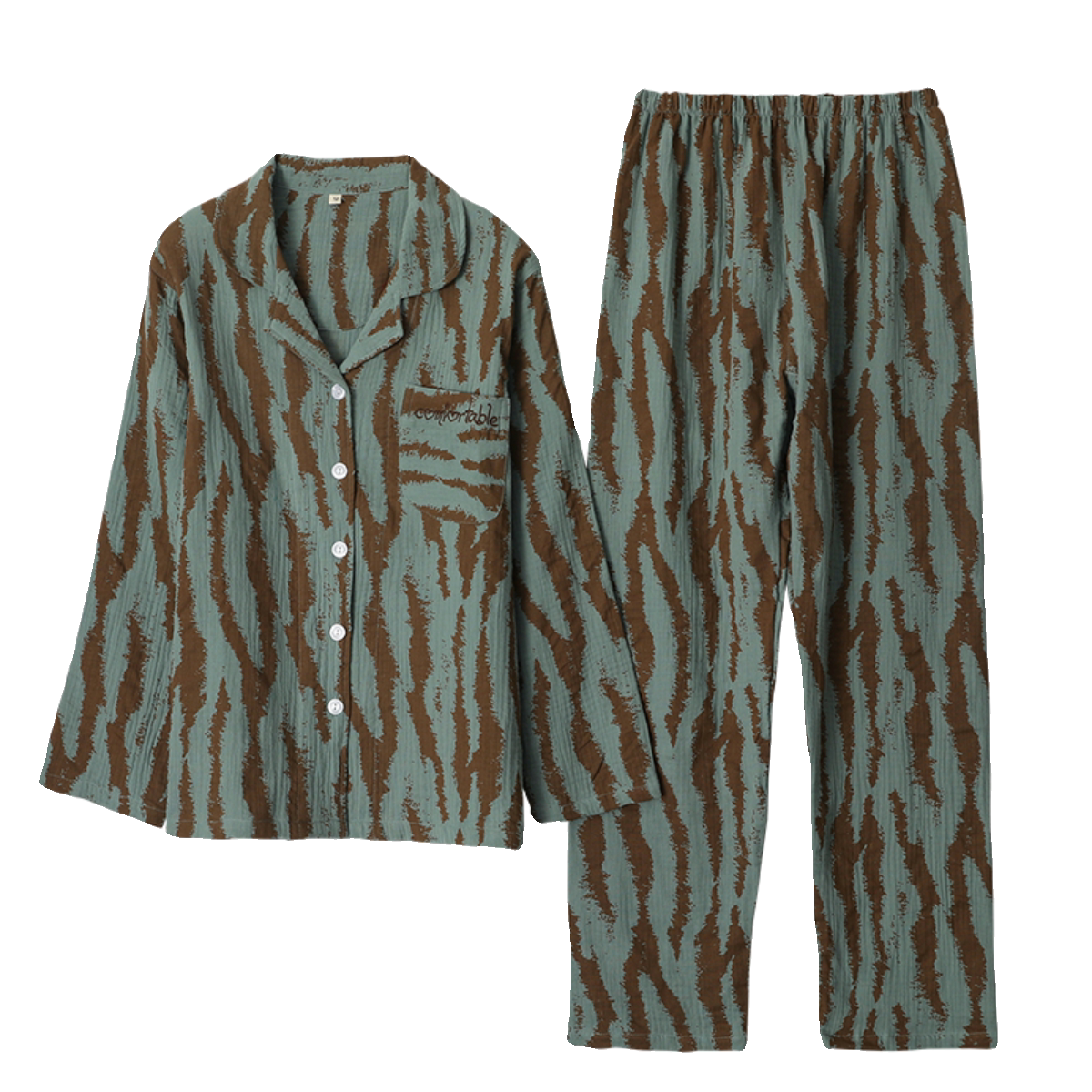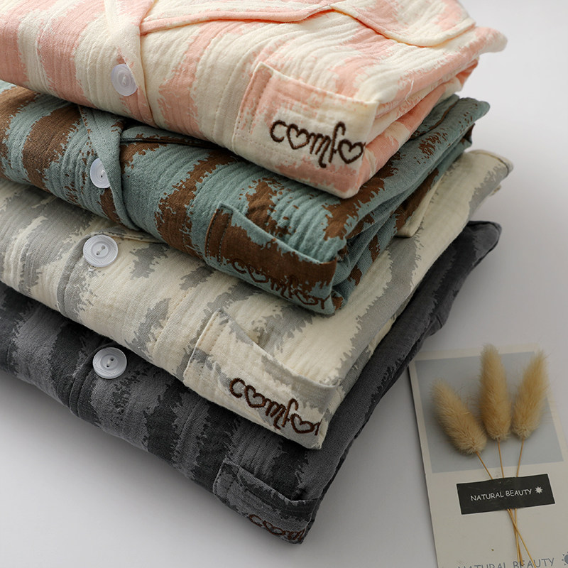 刺绣睡衣男女水洗纯棉纱日系翻领花纹长袖长裤春夏家居睡眠服薄款