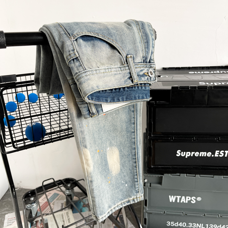 街头复古水洗做旧扎染破洞牛仔裤男士韩版宽松直筒bf休闲拖地长裤