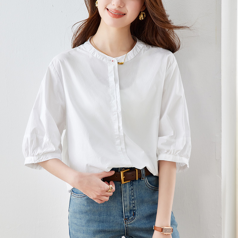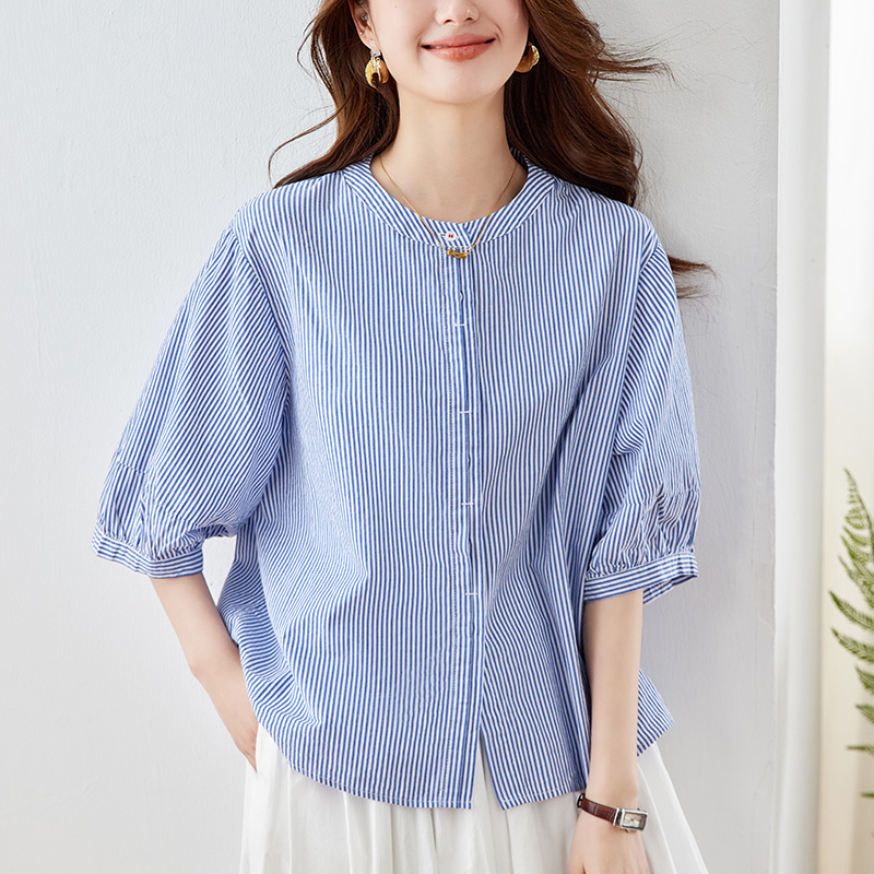 初影 圆领蓝条纹衬衫女短袖2025夏装新款上衣宽松休闲纯棉衬衣