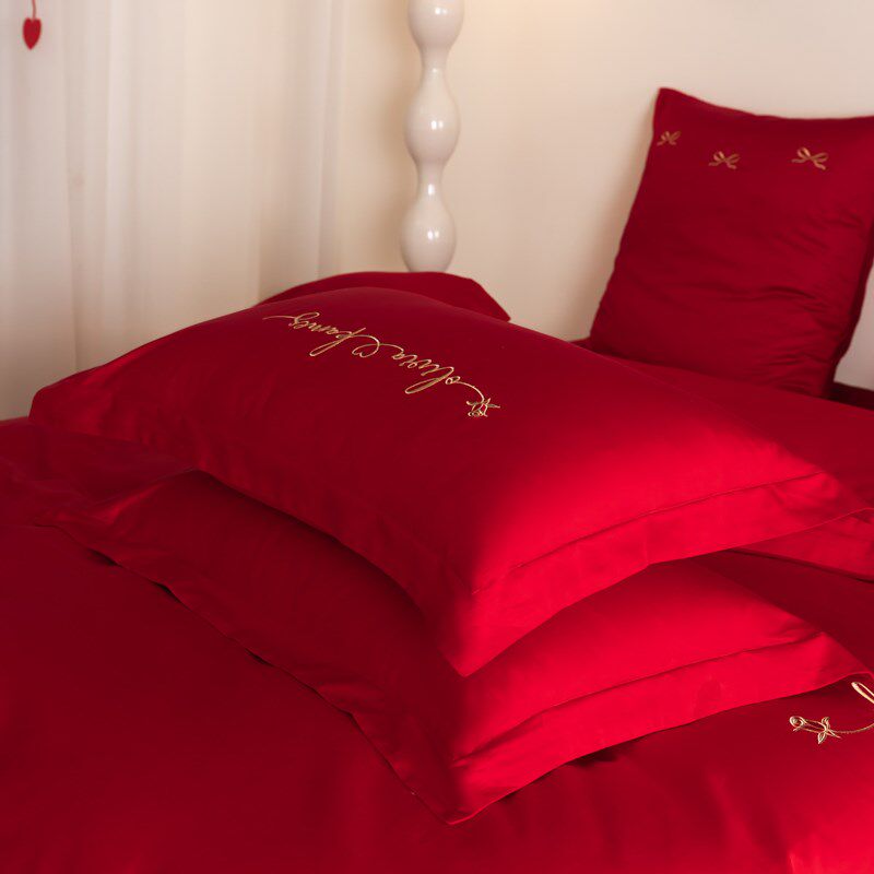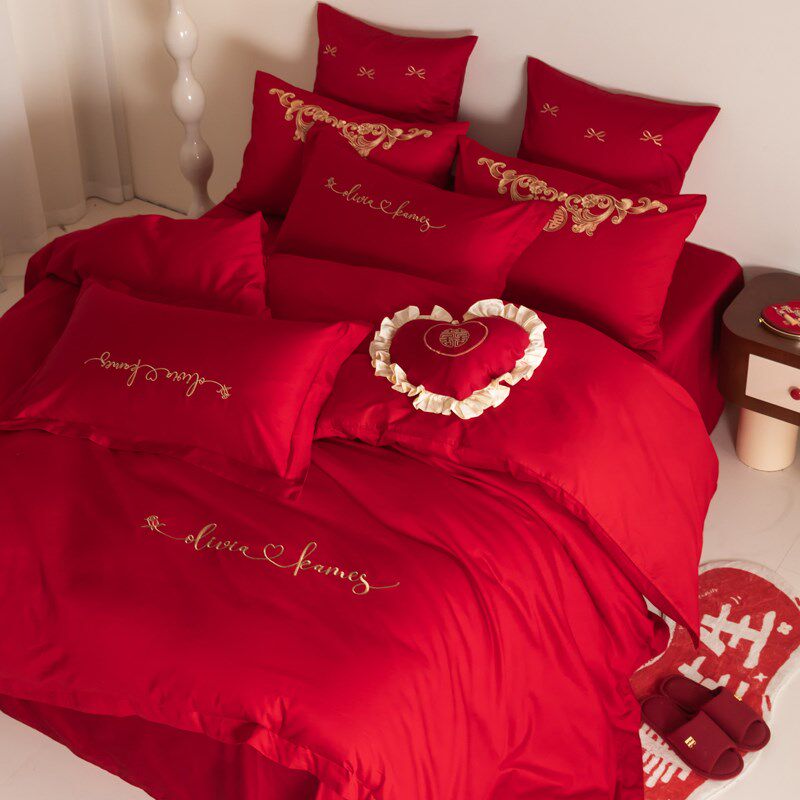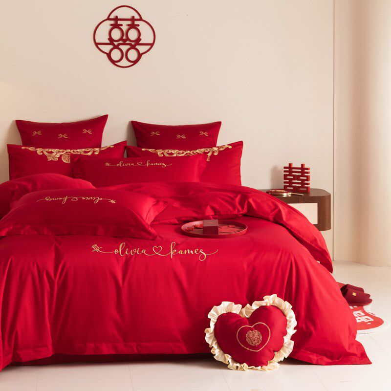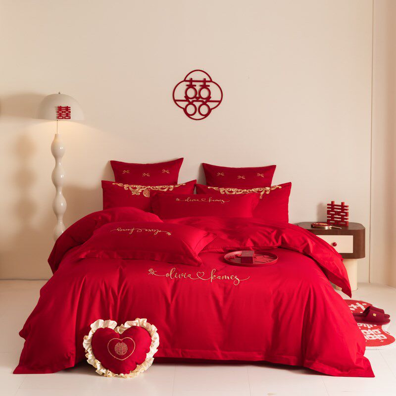 新中式长绒棉结婚j四件套红色床单纯棉全棉被套婚房陪嫁喜被床笠