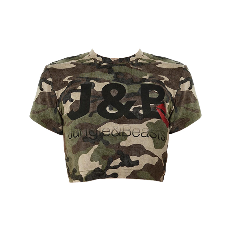 美式高街复古辣妹露脐短款T恤夏季迷彩做旧弹力修身短袖y2k上衣女