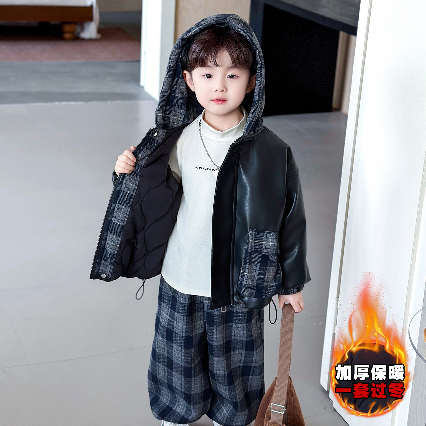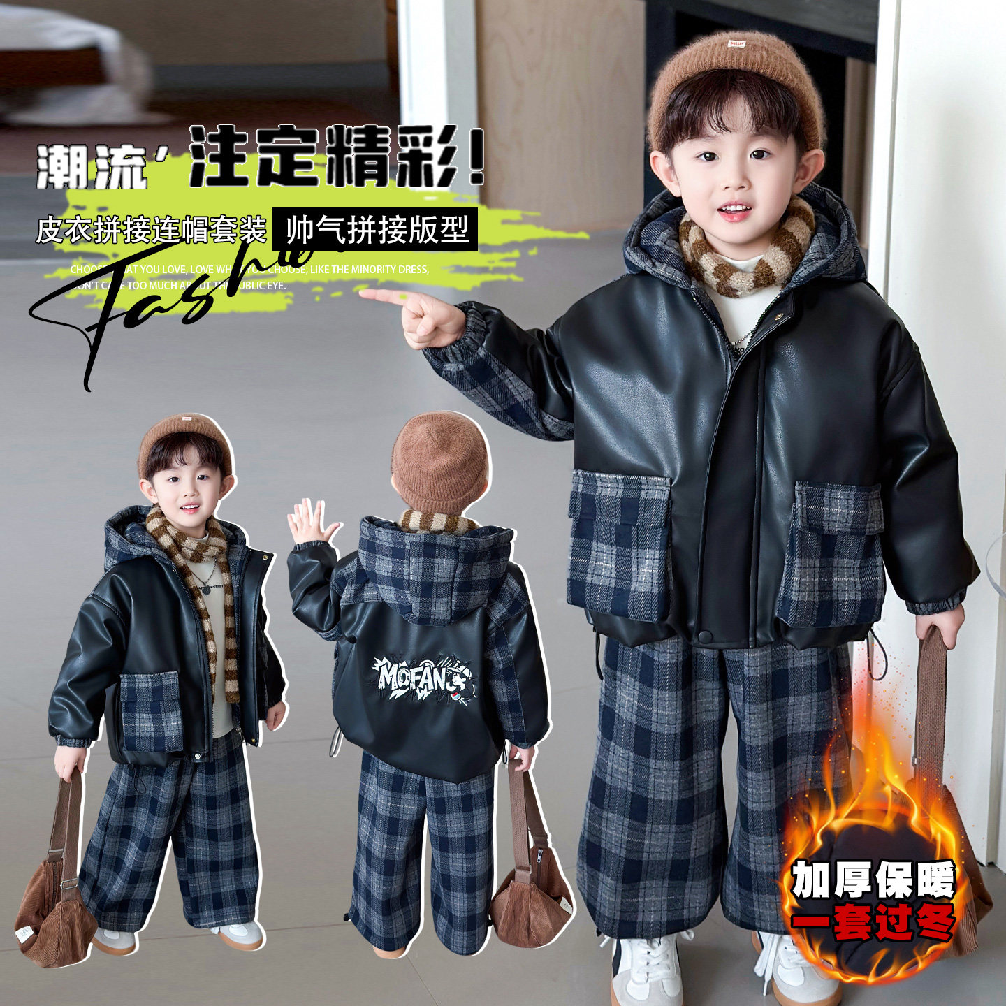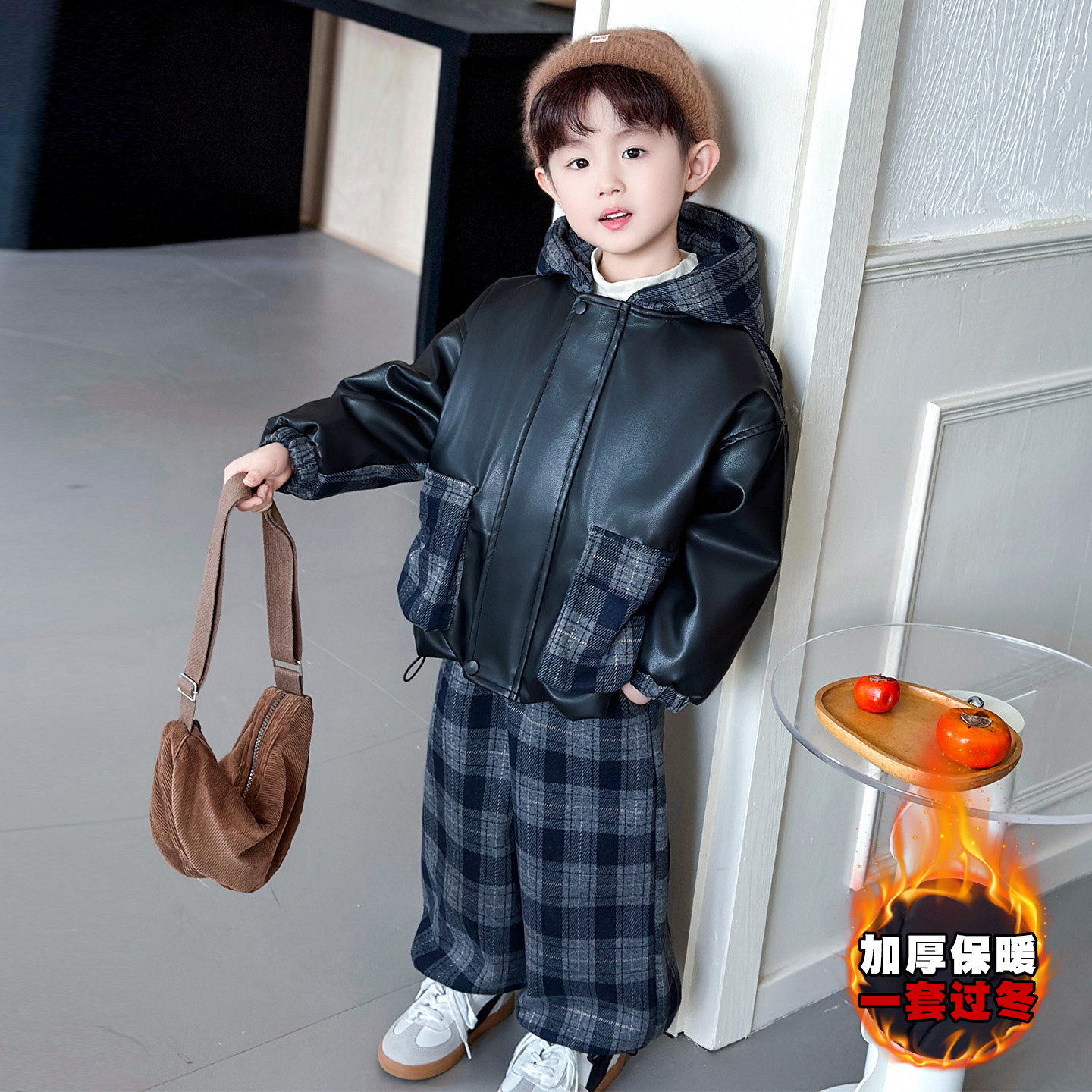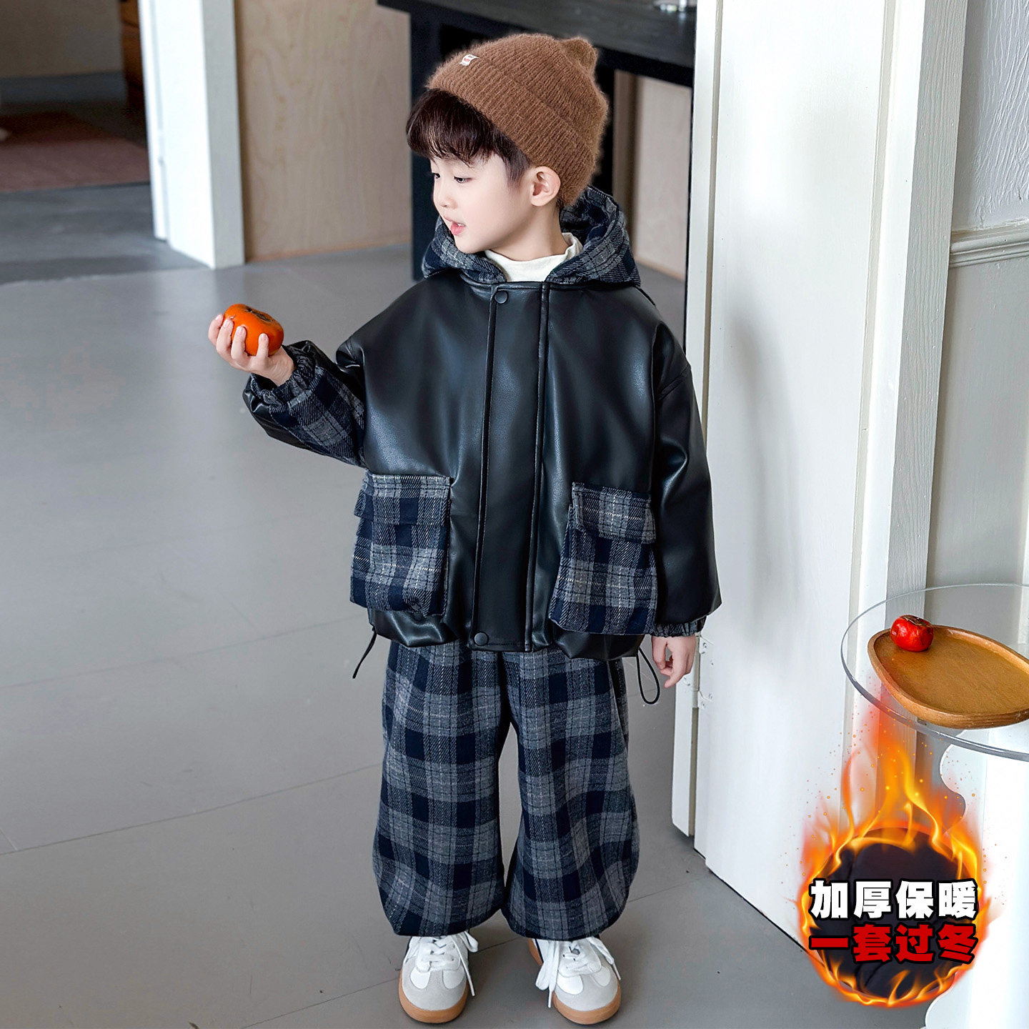 男童套装加绒加厚2025新款秋冬韩版痞帅儿童冬装男孩皮衣两件套潮