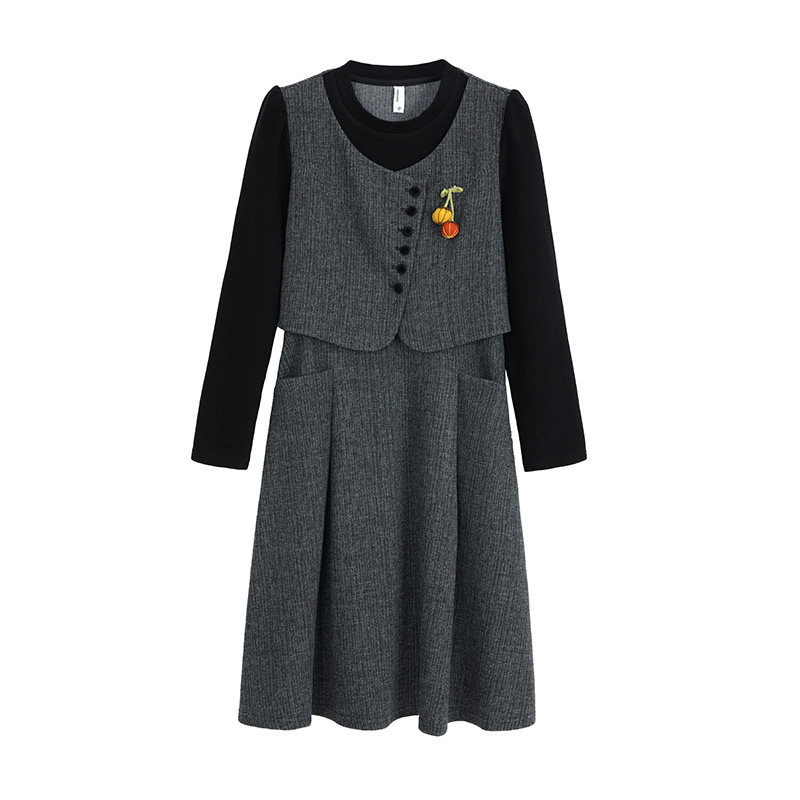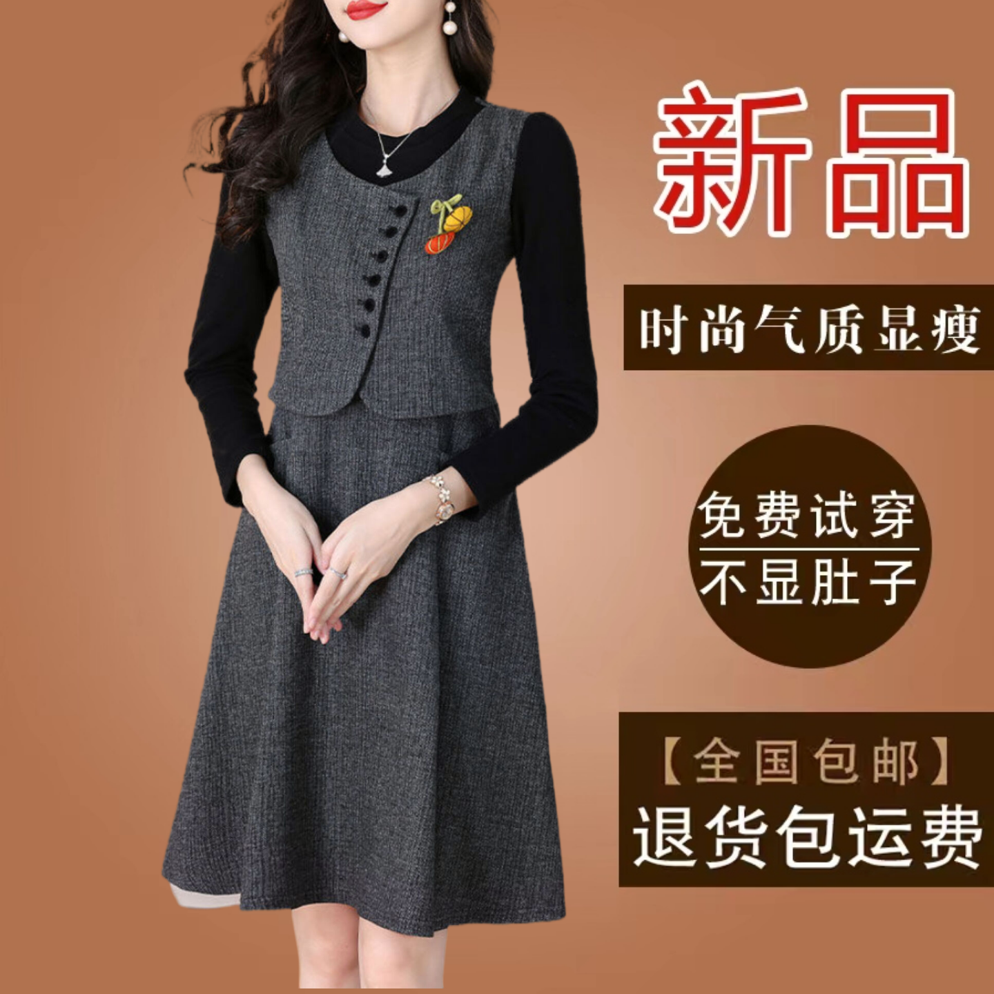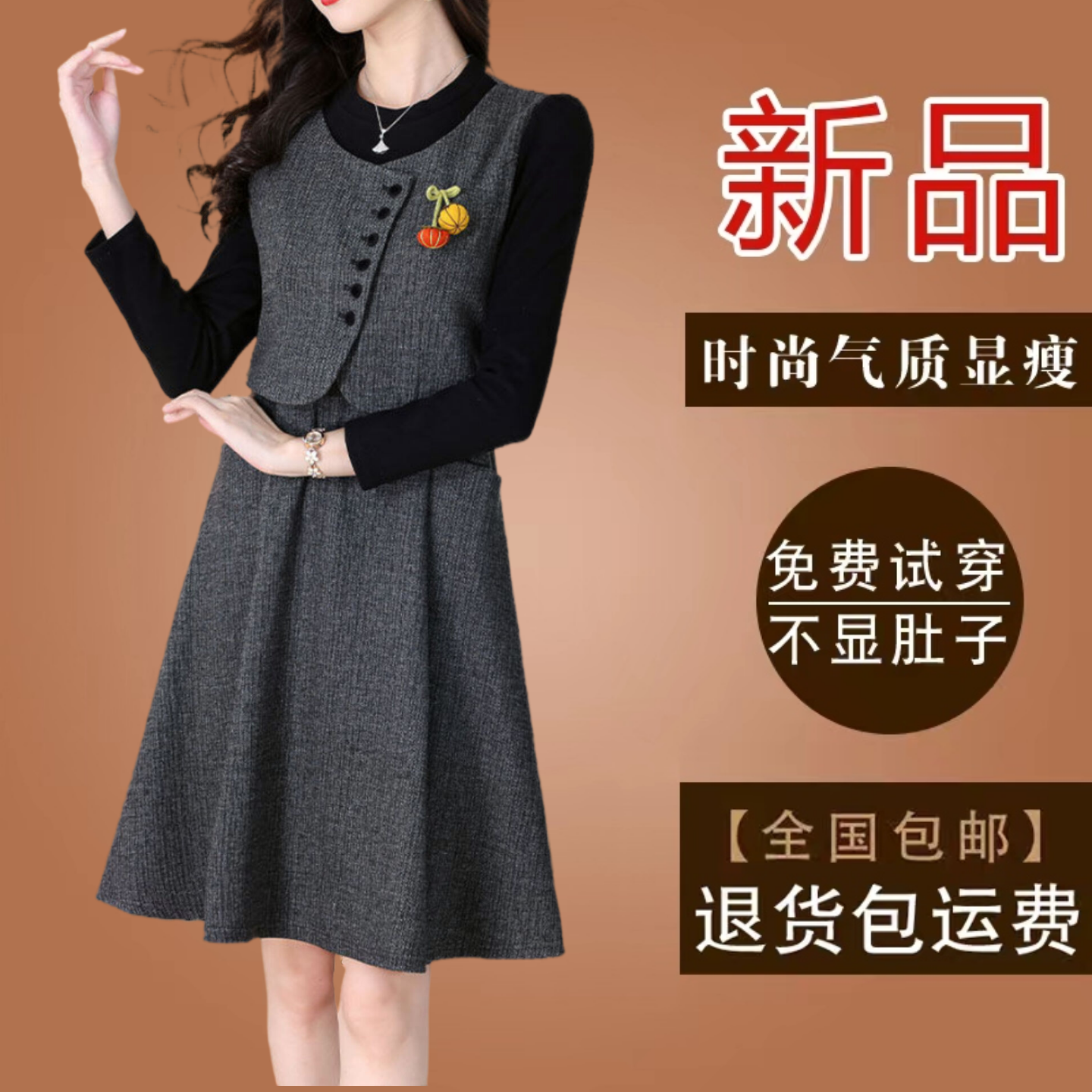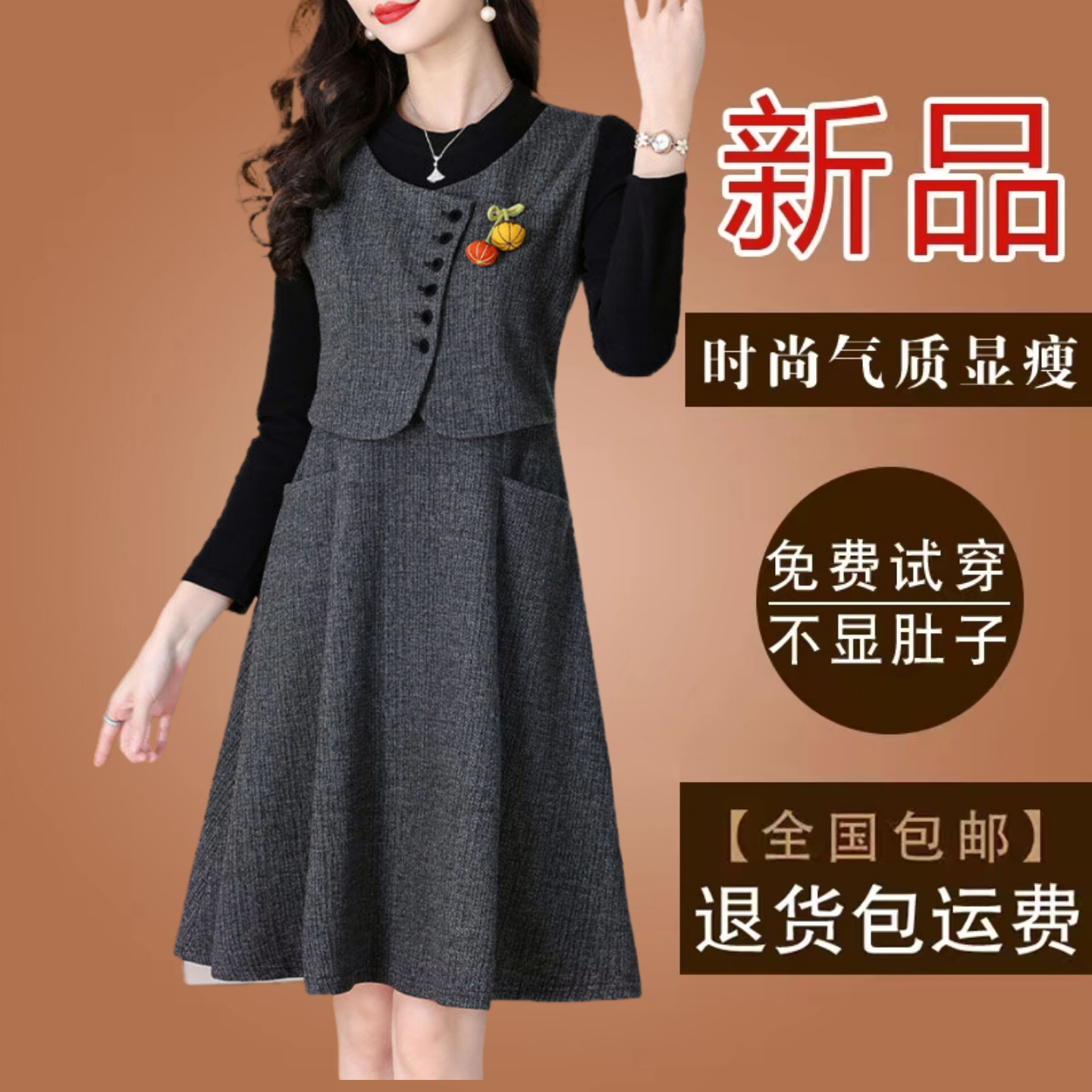 配大衣假两件中老年妈妈连衣裙2025秋冬新款长袖气质遮肚打底裙子
