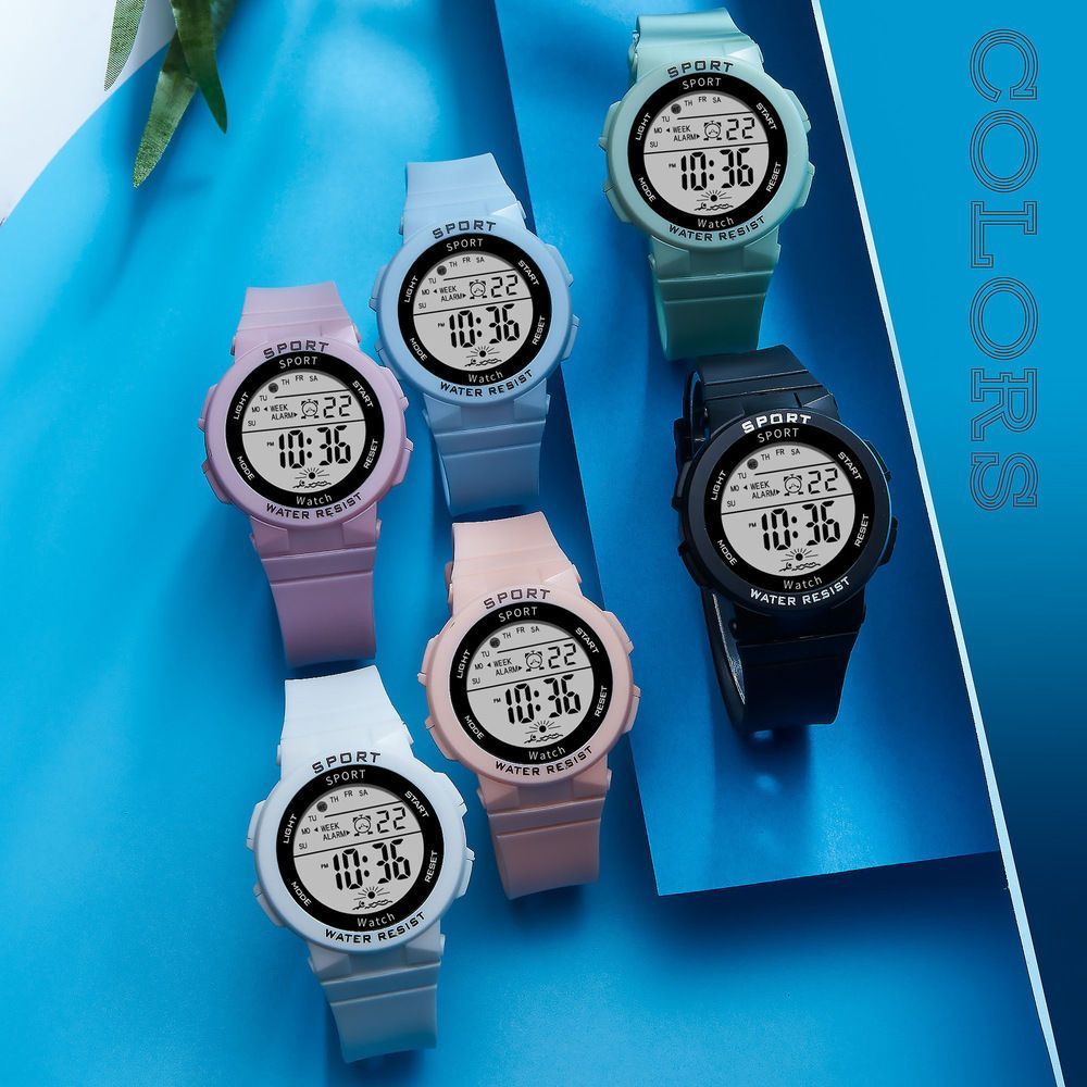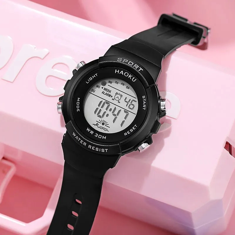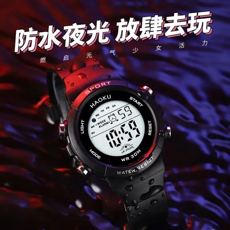 黑色电子手表男高初中学生潮流男女孩圆形防水夜光运动多功能闹钟