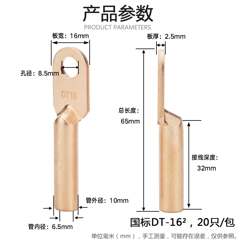 DT-16平方铜鼻子堵油铜线鼻铜接头 电缆电线耳接线端子 国标A紫铜