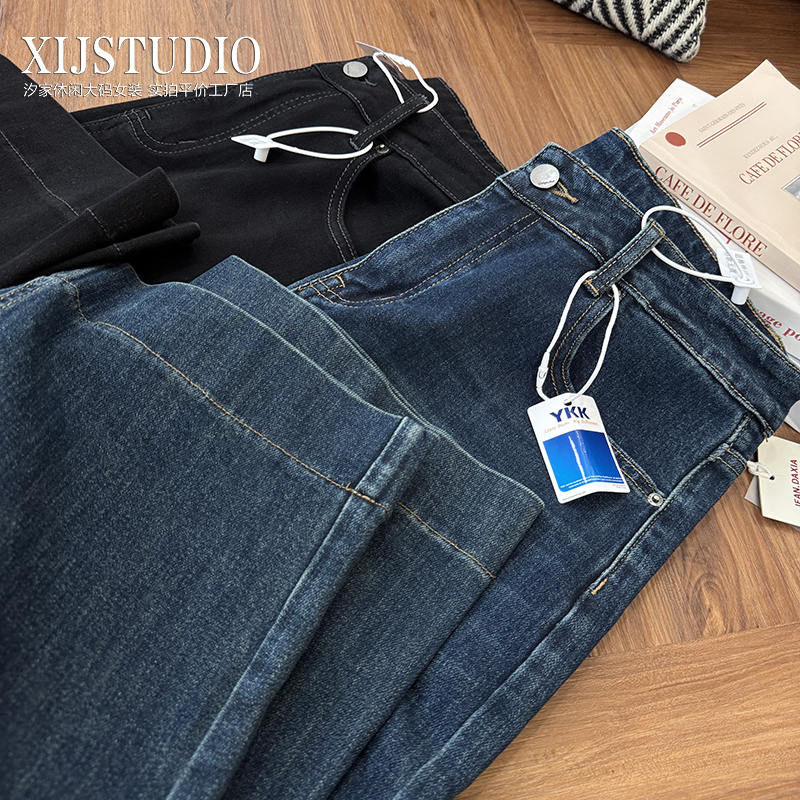 汐家女裤 高腰两色宽边直筒裤秋季大码高性价比微弹九分牛仔裤