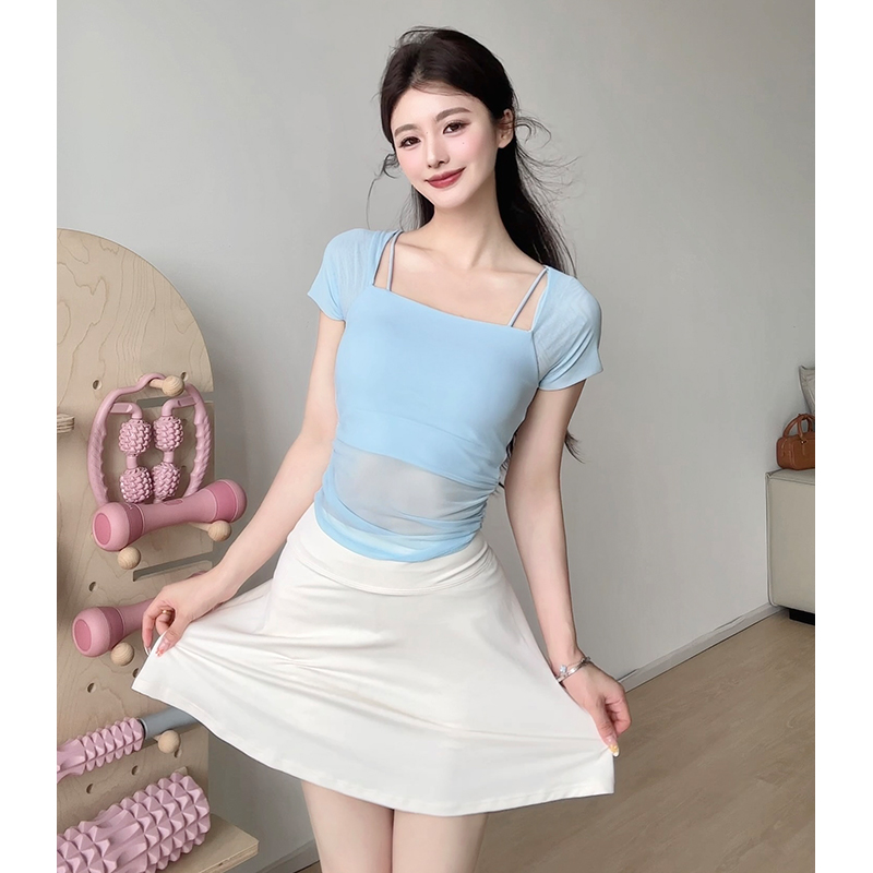 gogoyoga网纱瑜伽服短袖女带胸垫夏透气普拉提训练服运动健身上衣