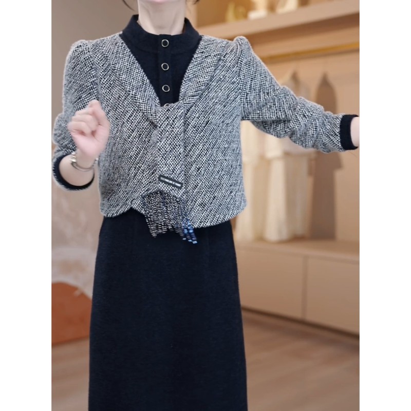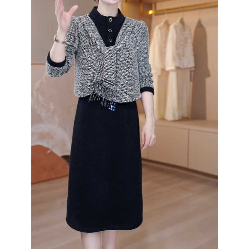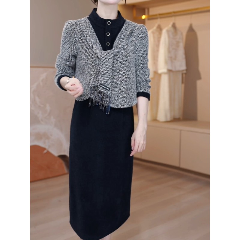 小香风气质高端优雅件连衣裙2025秋冬季新款收腰显瘦假俩中长裙子