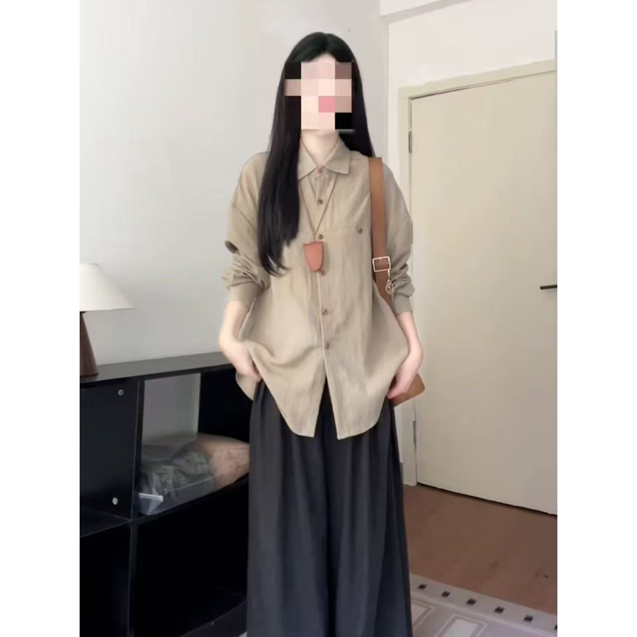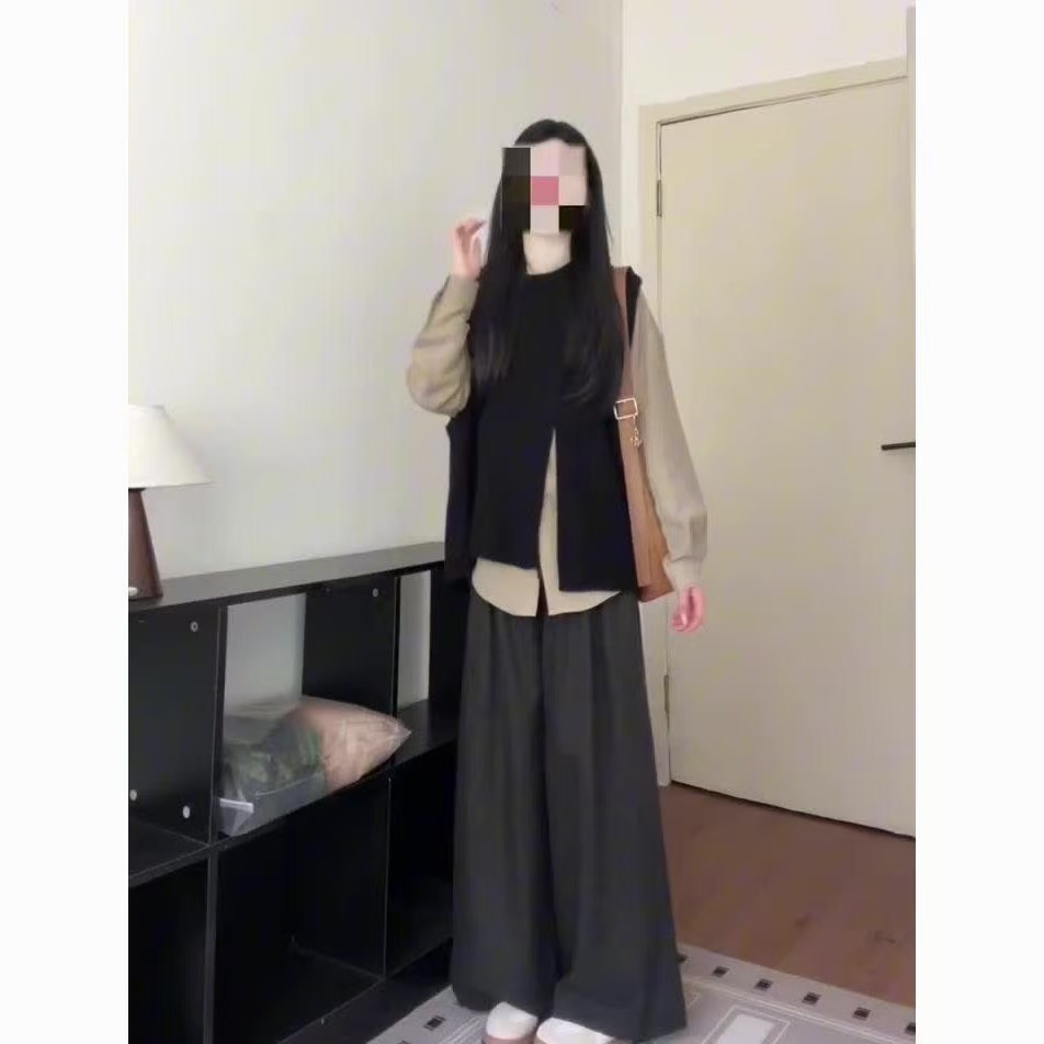 针织马甲叠穿长袖衬衫阔腿裤套装