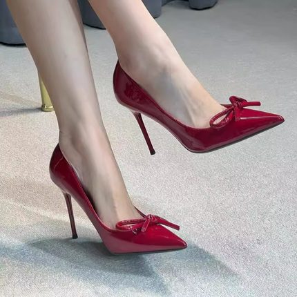2025春季新款酒红色蝴蝶结法式高跟鞋女漆皮气质浅口尖头细跟单鞋