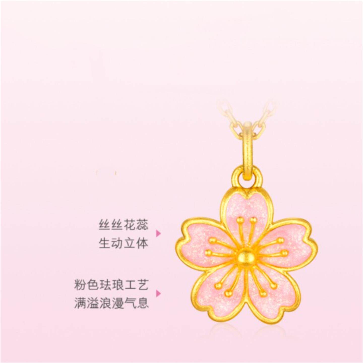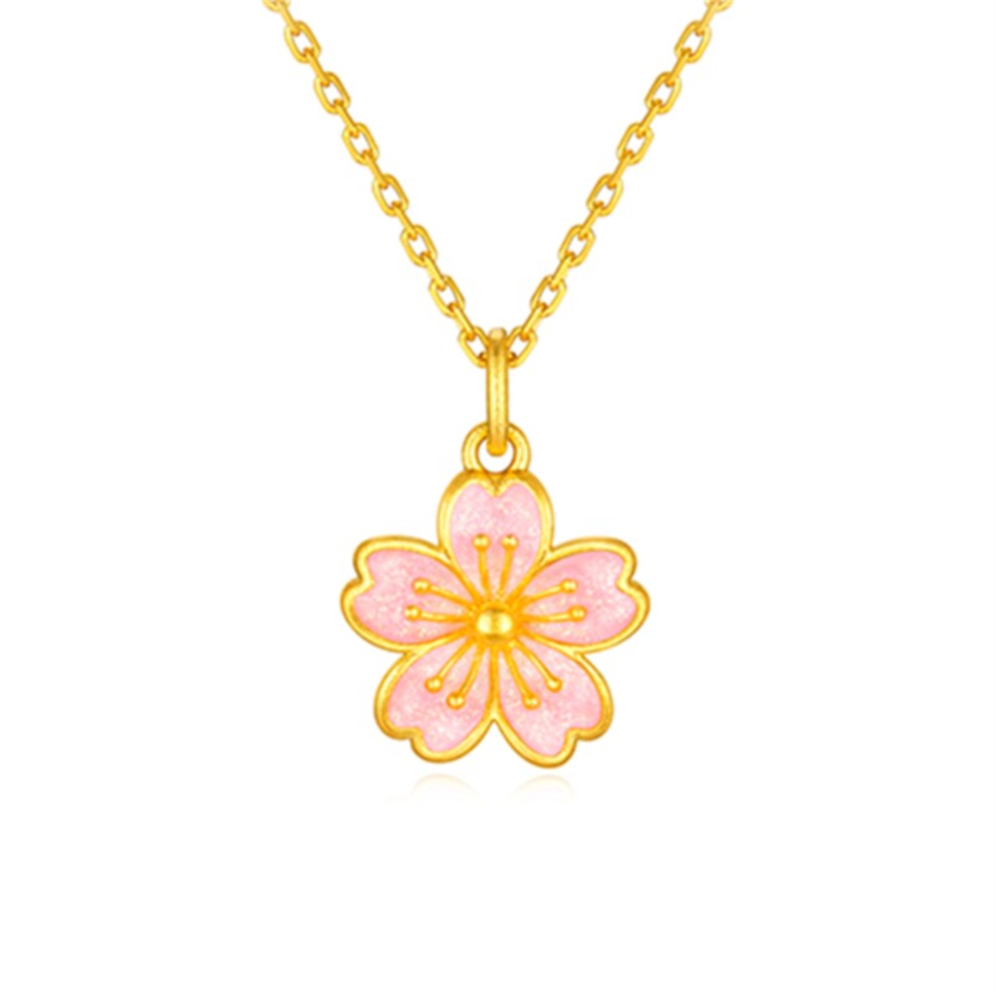 粉项链纯银镀黄金色 女福满传家花朵珐琅古法桃花锁骨链礼物
