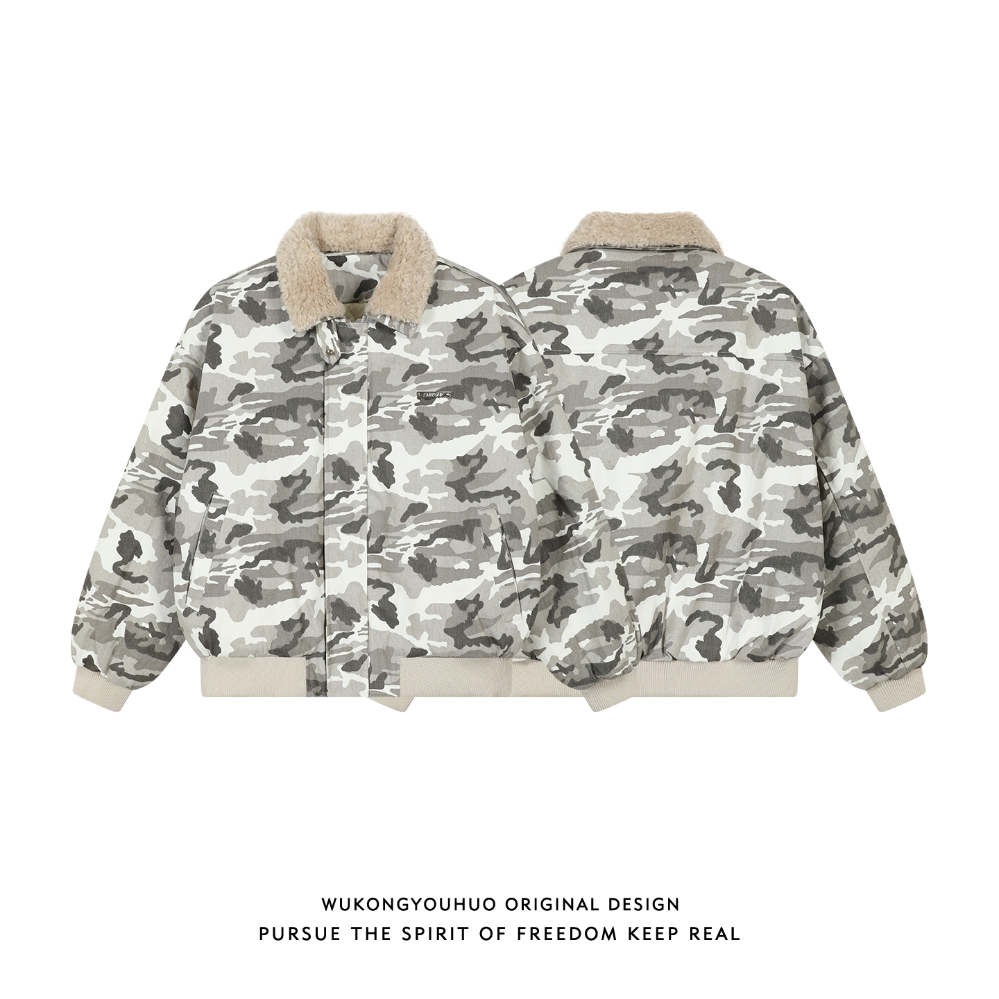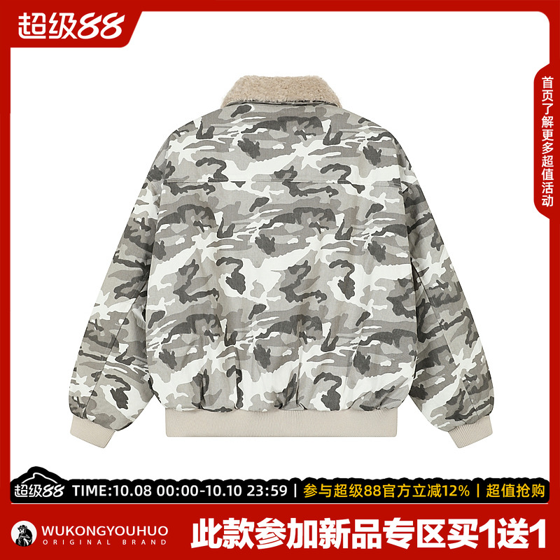 悟空有货冬季嘻哈迷彩毛绒翻领棉衣男女潮牌宽松夹棉保暖棉服外套