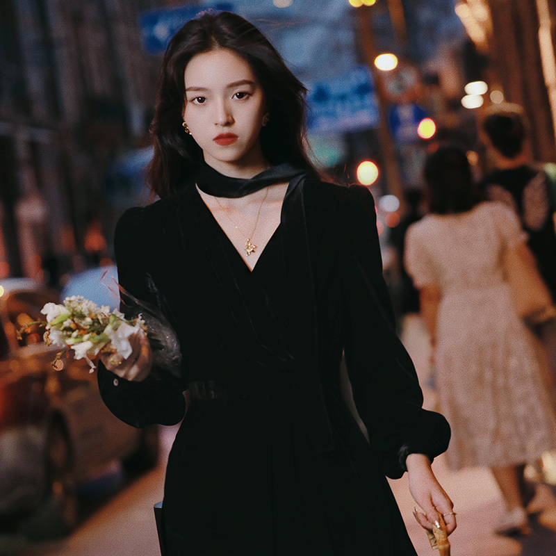 AZure法式复古长裙V领仿真丝绒连衣裙高腰飘带裙灯笼袖长袖小黑裙