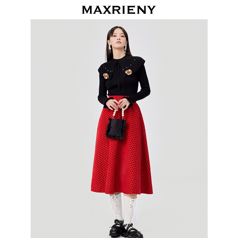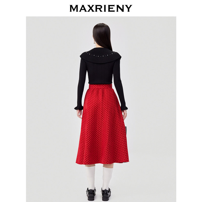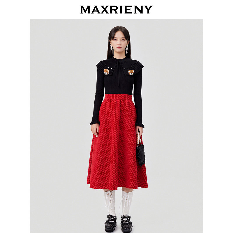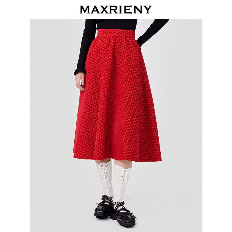 【奥莱】MAXRIENY提花半身裙春季新年红复古圆摆长裙