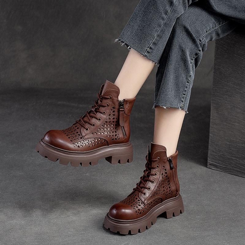夏季舒适休闲厚底马丁靴头层牛皮高帮洞洞女靴防水台凉鞋