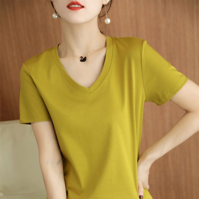 80支双面丝光棉纯色短袖t恤女夏季新款纯棉宽松圆领半袖V领上衣