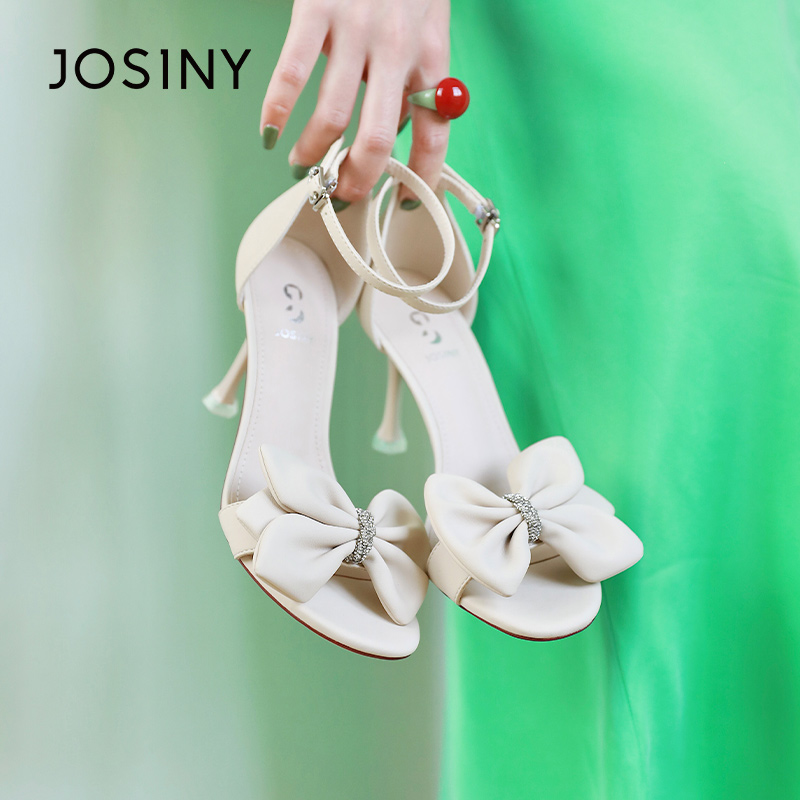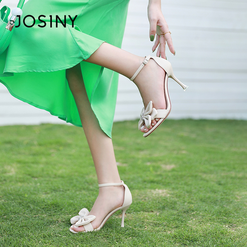 卓诗尼女鞋露趾细跟凉鞋蝴蝶结一字扣带夏新款时尚后包跟高跟凉鞋