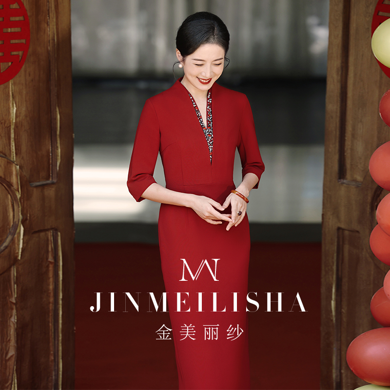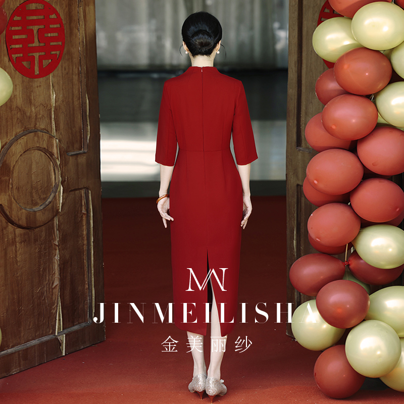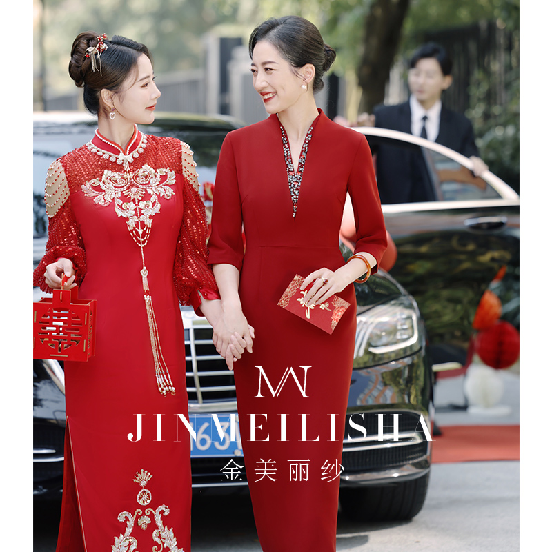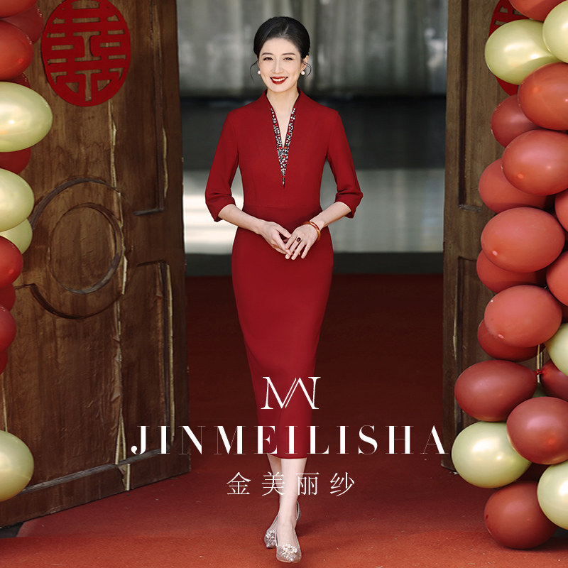婚礼妈妈装礼服高端洋气修身酒红色长袖结婚喜婆婆婚宴晚礼服气质