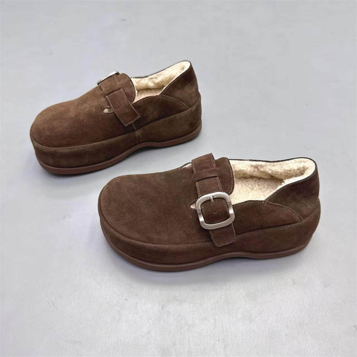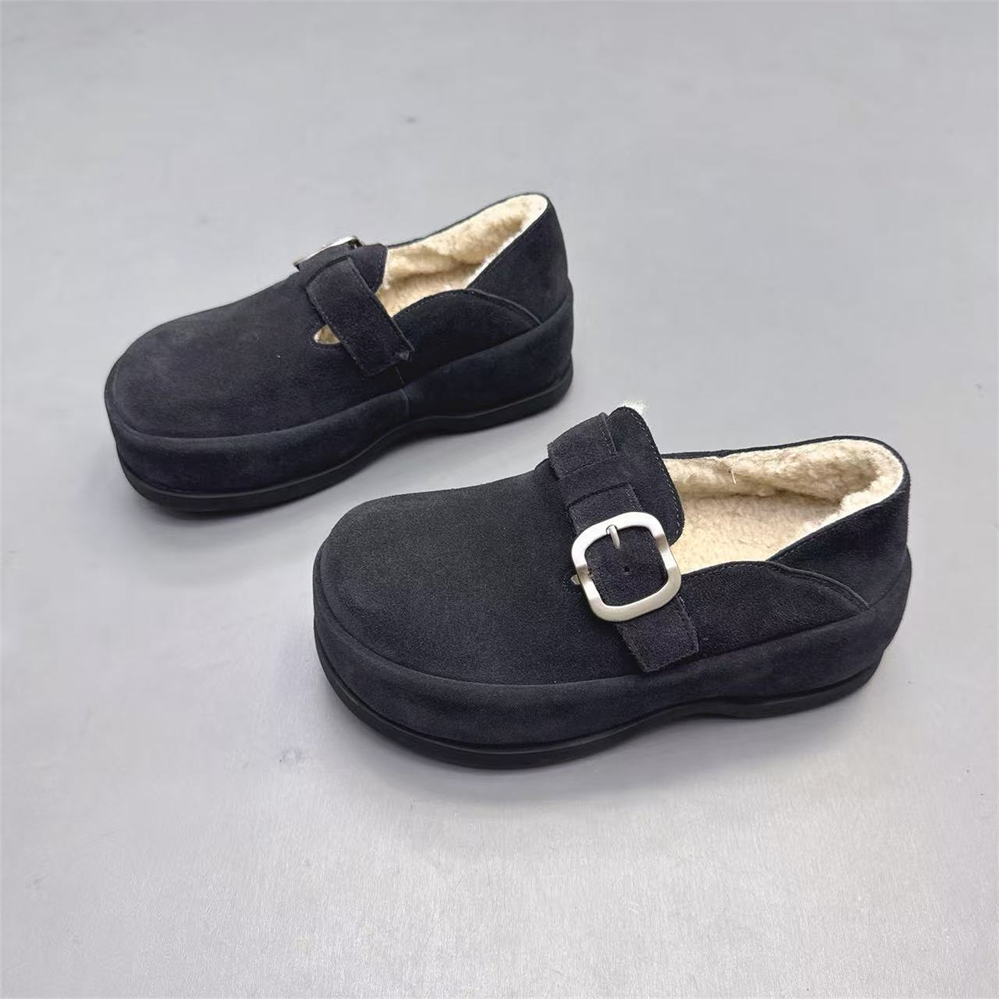 真皮女鞋厚底增高6CM加绒两穿勃肯鞋2025冬新款复古皮带扣乐福鞋