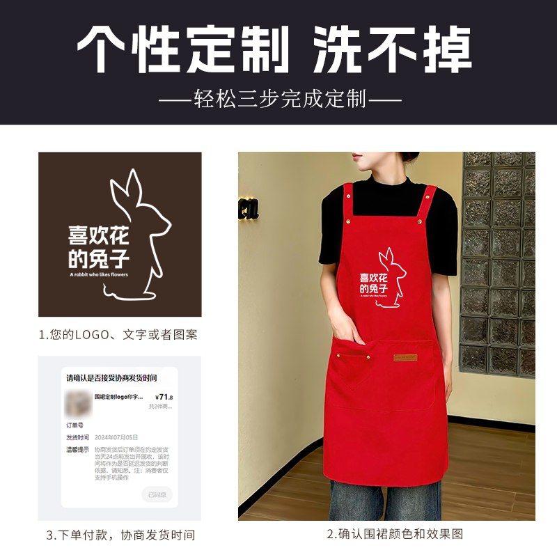 防水围裙工作服餐饮专用定制logo印字订制做饭服务员围腰男女红色