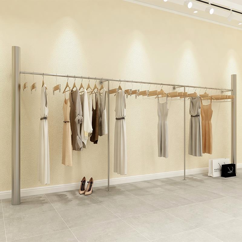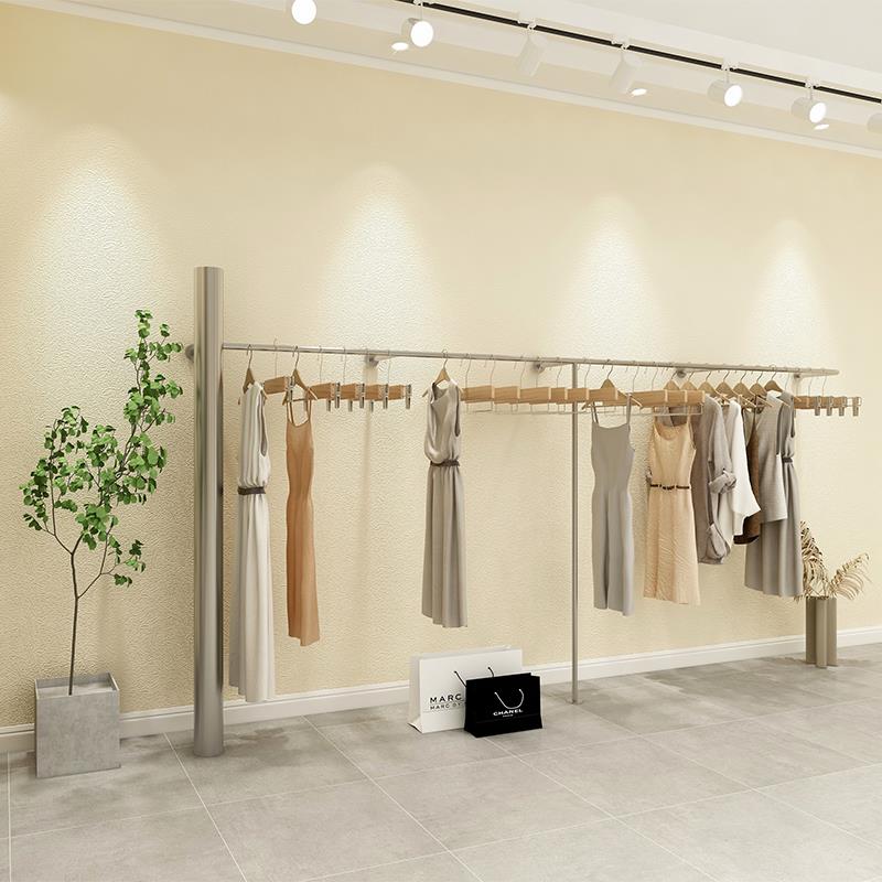 高档服装店壁挂展示架不锈钢拉丝上墙女装货架银色童装店陈列转角