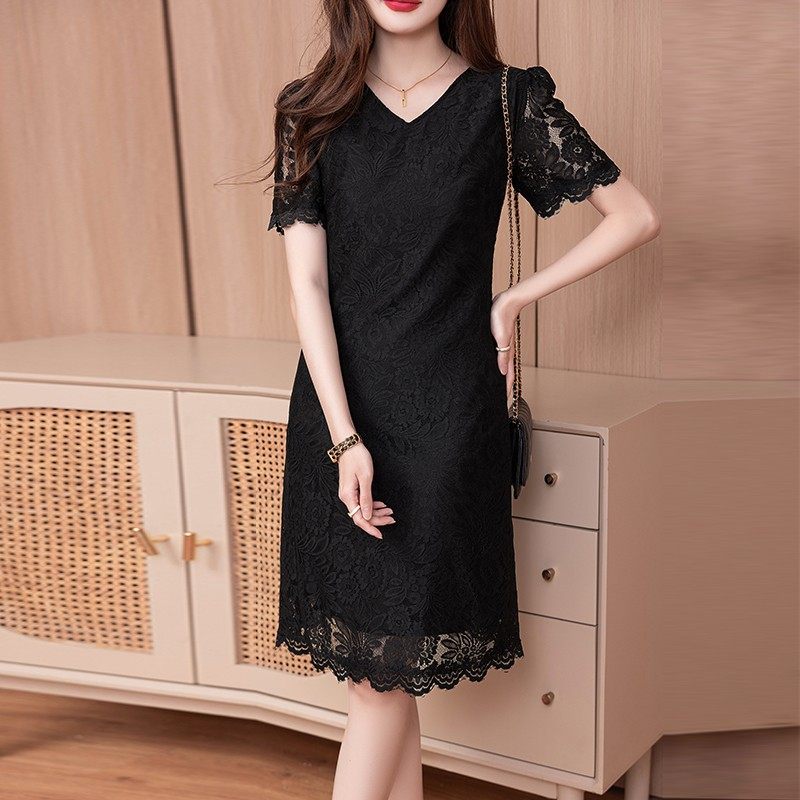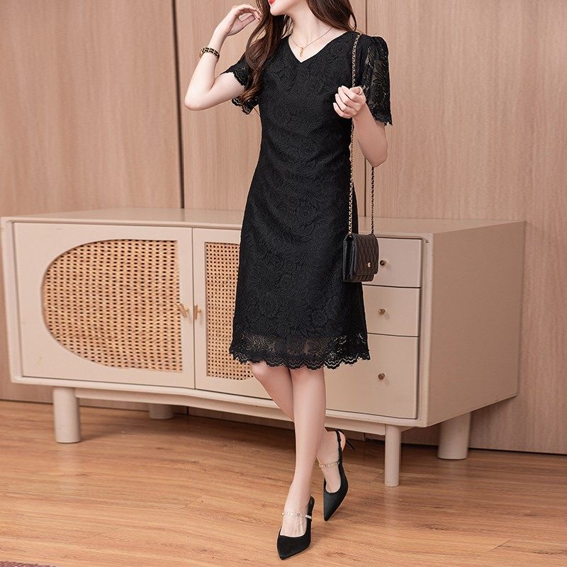 黑色大码女装连衣裙2025年新款夏季气质微胖mm遮肚子显瘦蕾丝中裙