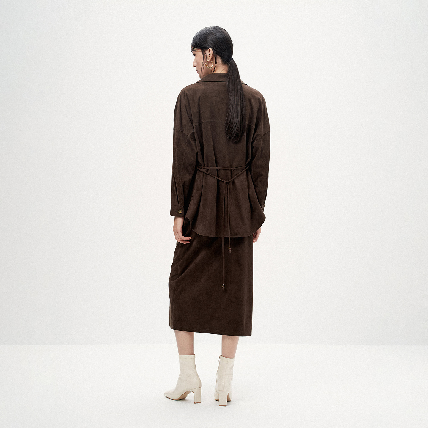 Re-BLUE轻奢优雅女装复古摩登翻领一手长衬衫式系带麂皮外套