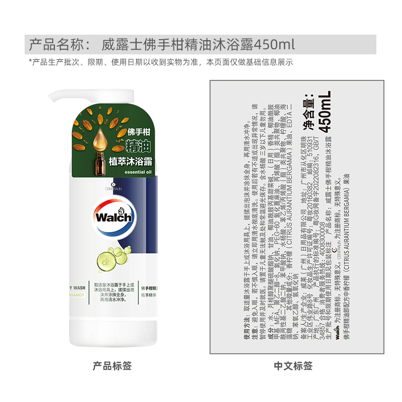 威露士佛手柑精油沐浴露沐浴乳450ml轻盈奢香滋润保湿男女喜爱