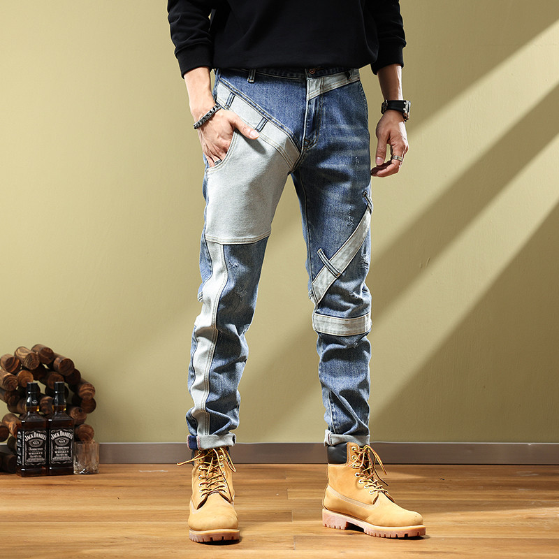 秋冬款时尚百搭牛仔裤男潮牌欧美修身小脚弹力长裤男拼接破洞蓝色